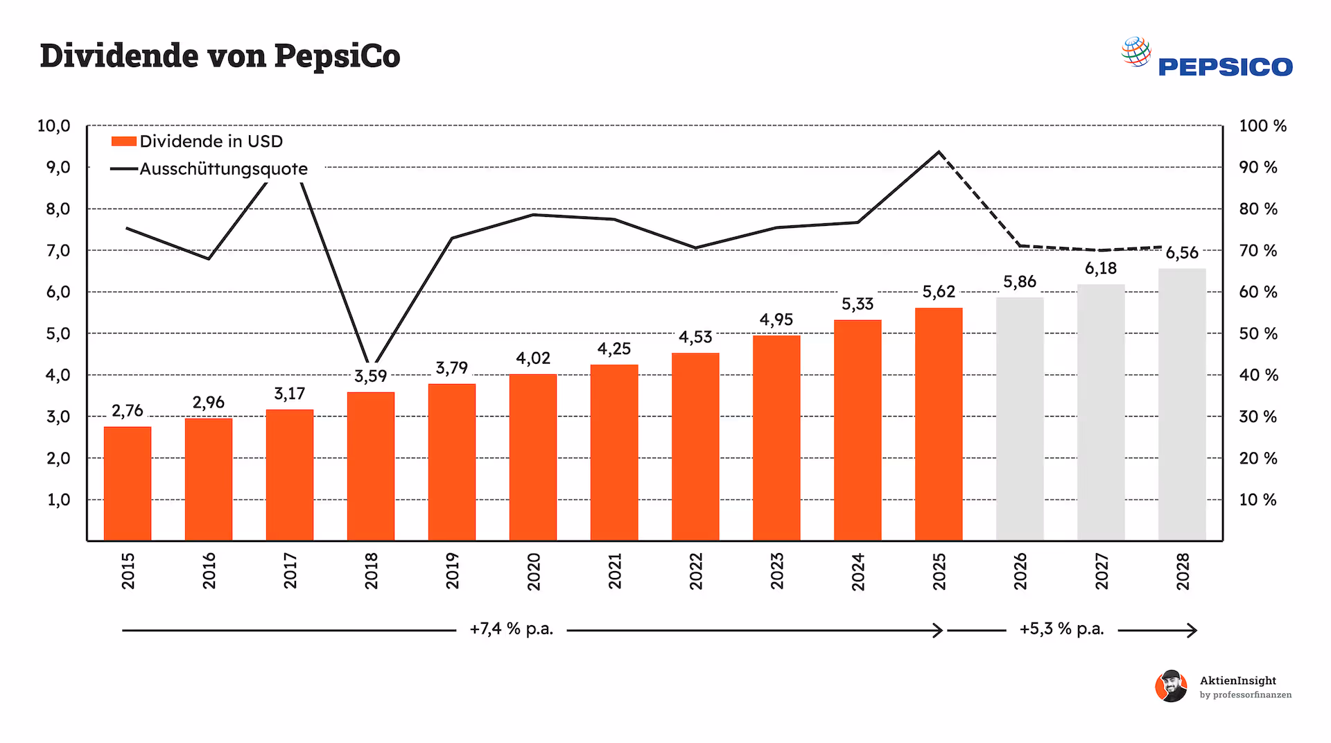 Temporär erhöhte Ausschüttungsquote. Die Ausschüttungsquote stieg 2025 auf rund 94 %, da PepsiCo nahezu den gesamten Free Cashflow als Dividende ausschüttete. Hintergrund waren erhöhte Investitionen und gestiegene Kosten, während der Cashflow temporär unter Druck stand. Gleichzeitig blieb die Dividendenpolitik unverändert. Mit erwarteter Margenerholung und sinkenden Investitionen sollte sich die Quote wieder auf ein nachhaltiges Niveau von etwa 65–75 % normalisieren.