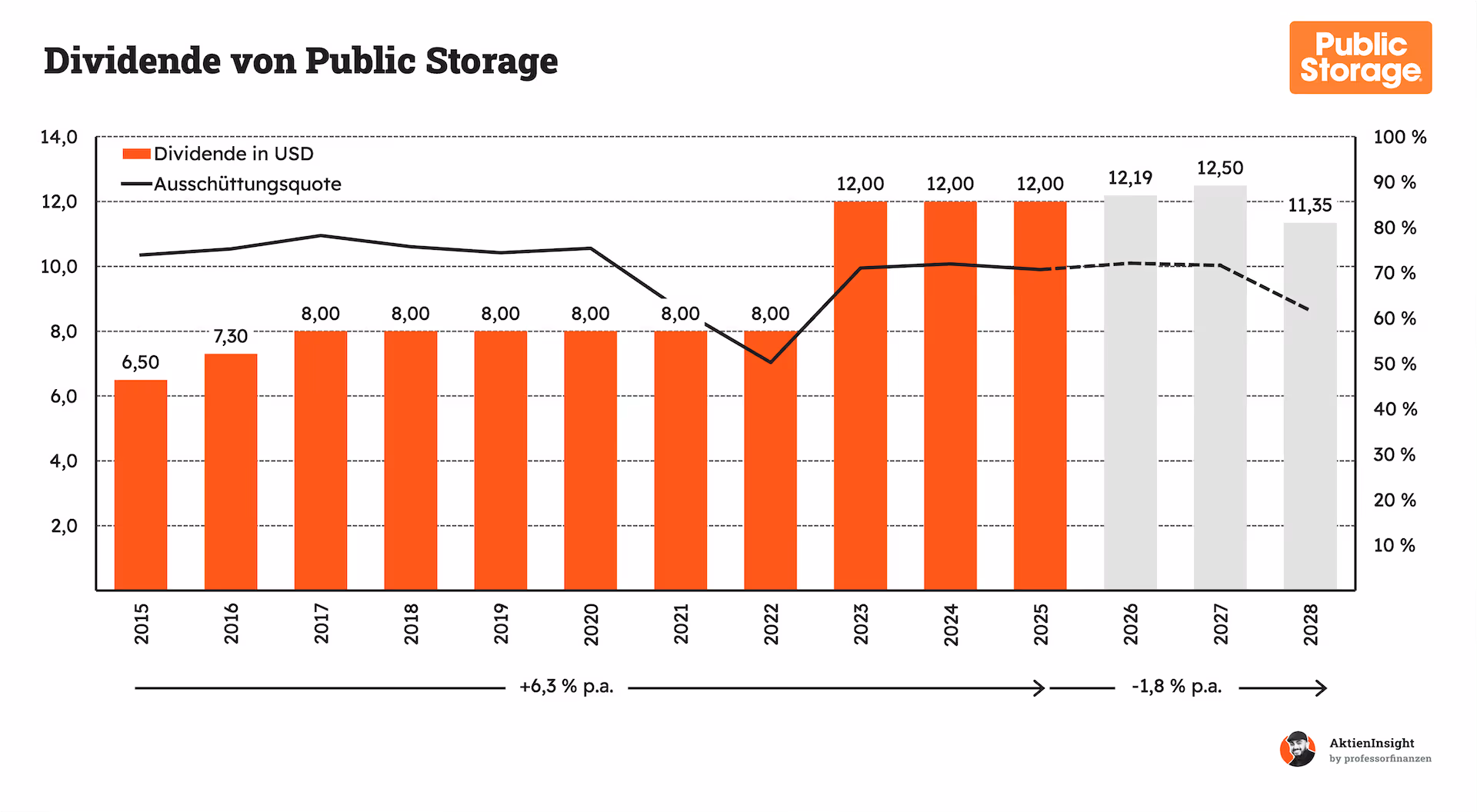 Public Storage hielt seine Dividende über viele Jahre konstant bei 8,00 USD je Aktie. Erst 2023 kam die deutliche Erhöhung auf 12,00 USD. Das entspricht einem Wachstum von rund 6,3 % pro Jahr bis 2025. Die lange Konstanz zeigt Disziplin, während die Anhebung die starke operative Entwicklung widerspiegelt.