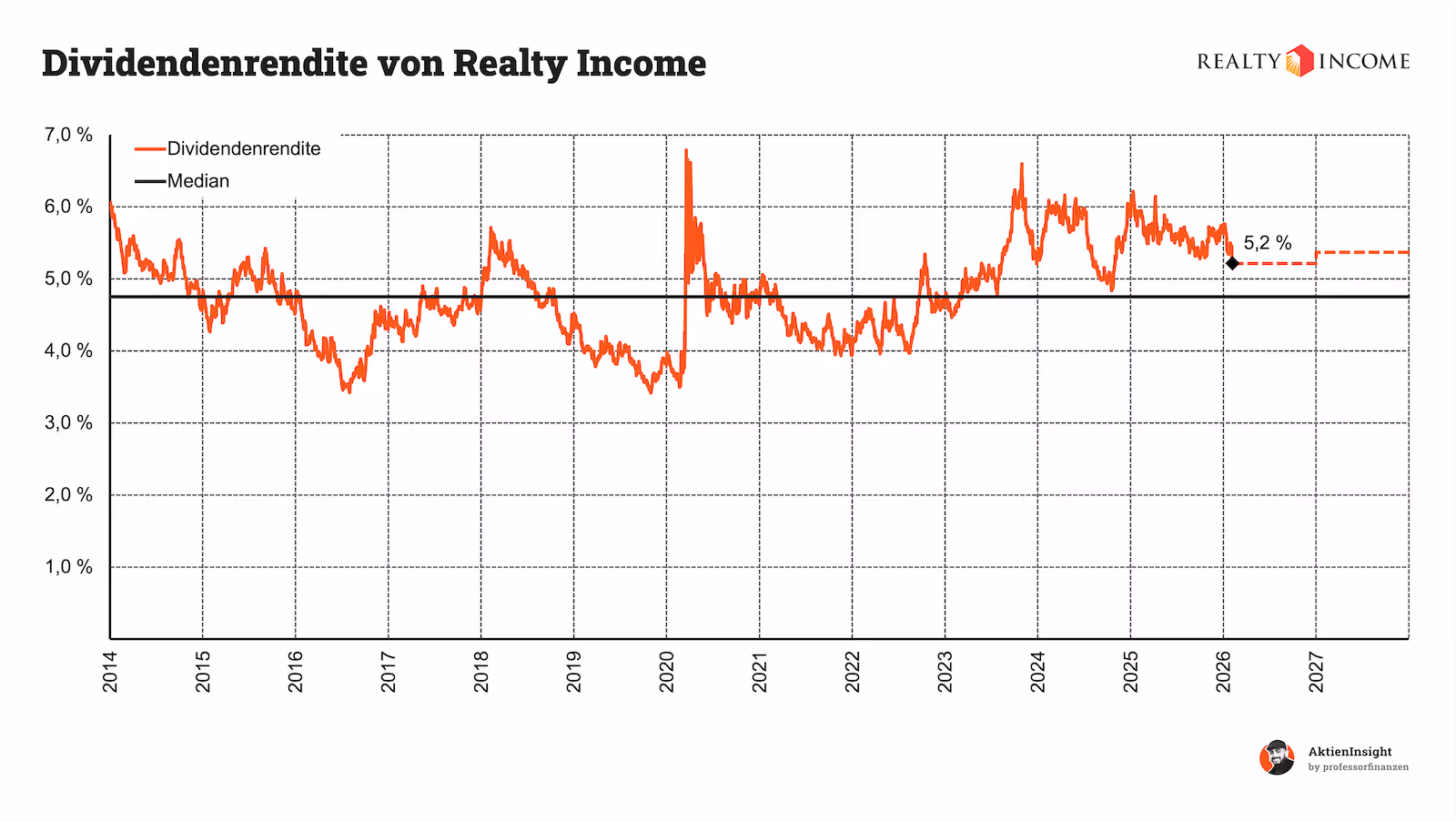 Die Ausschüttungsquote ist gesund. Während 2012 noch rund 90 % der AFFO ausgeschüttet wurden, liegt die Quote heute bei etwa 75 %. Für einen REIT ist das ein solider Wert und schafft Spielraum für Stabilität auch in schwierigeren Marktphasen. Mit einer aktuellen Dividendenrendite von 5,2 % liegt Realty Income auf einem historisch selten erreichten Niveau. In Kombination mit moderatem Wachstum ergibt sich langfristig eine attraktive Gesamtrendite für Dividendeninvestoren.