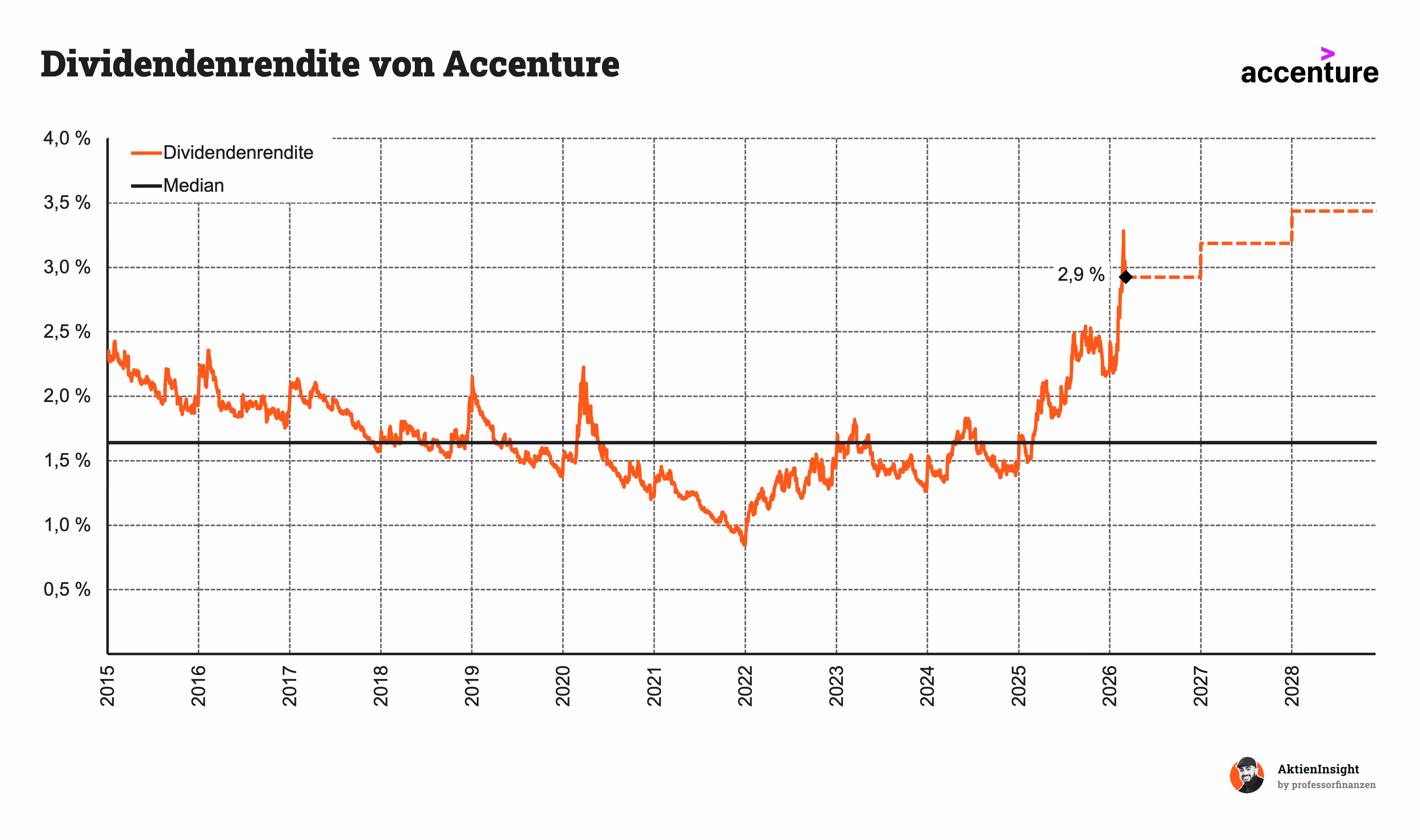 Stabiles Dividendenwachstum. Accenture erhöht seine Dividende seit 2005 jedes Jahr. In den letzten zehn Jahren lag das durchschnittliche Wachstum bei etwa 11,2 % pro Jahr. Das ist stark für ein Unternehmen dieser Größe. Die aktuelle Dividendenrendite liegt bei rund 2,9 % und damit deutlich über dem langfristigen Median von etwa 1,6 %.