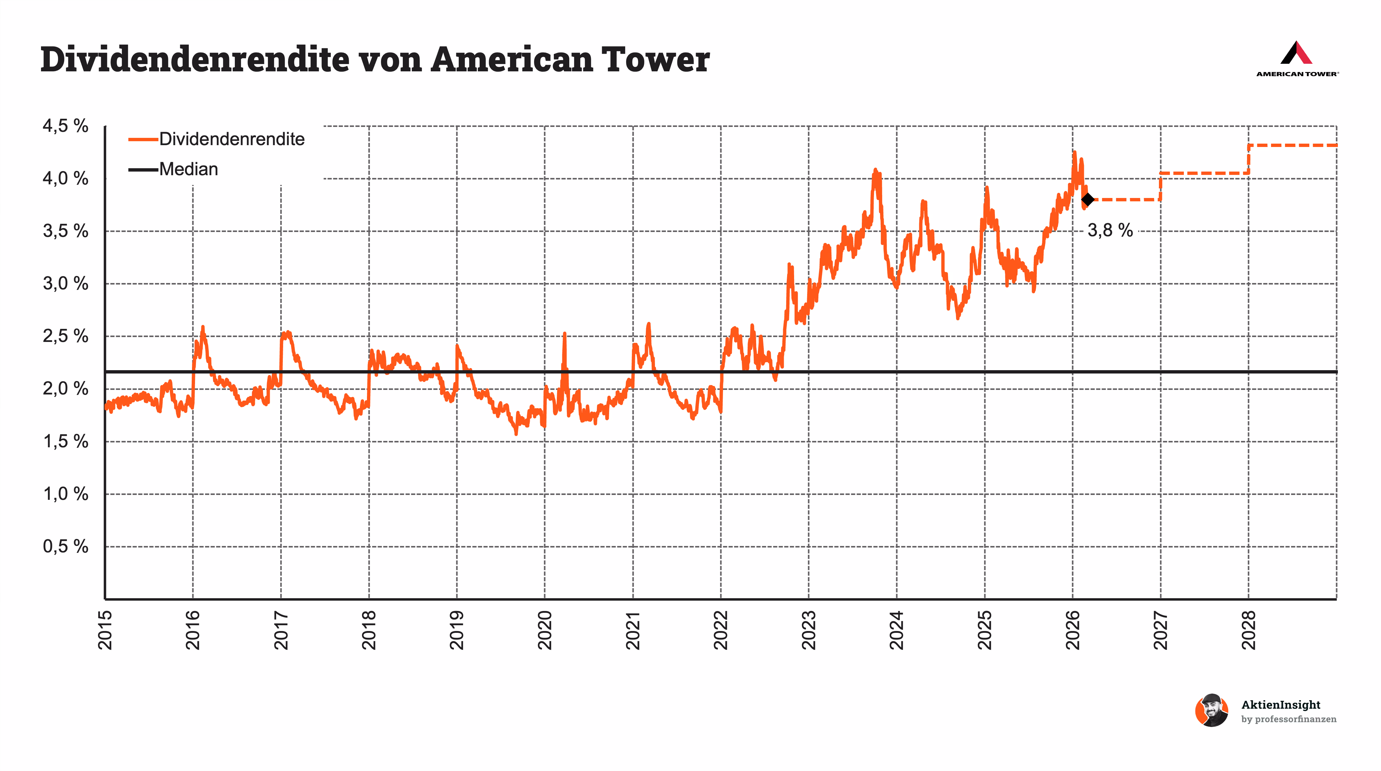 Die aktuelle Dividendenrendite von American Tower liegt bei etwa 3,8 % und damit deutlich über dem langfristigen Median von rund 2,1 %. In den letzten zehn Jahren bewegte sich die Rendite meist nahe oder sogar unter diesem Median. Erst seit 2023 ist sie deutlich gestiegen. Für langfristige Anleger kann das ein Hinweis auf eine attraktivere Bewertung sein.