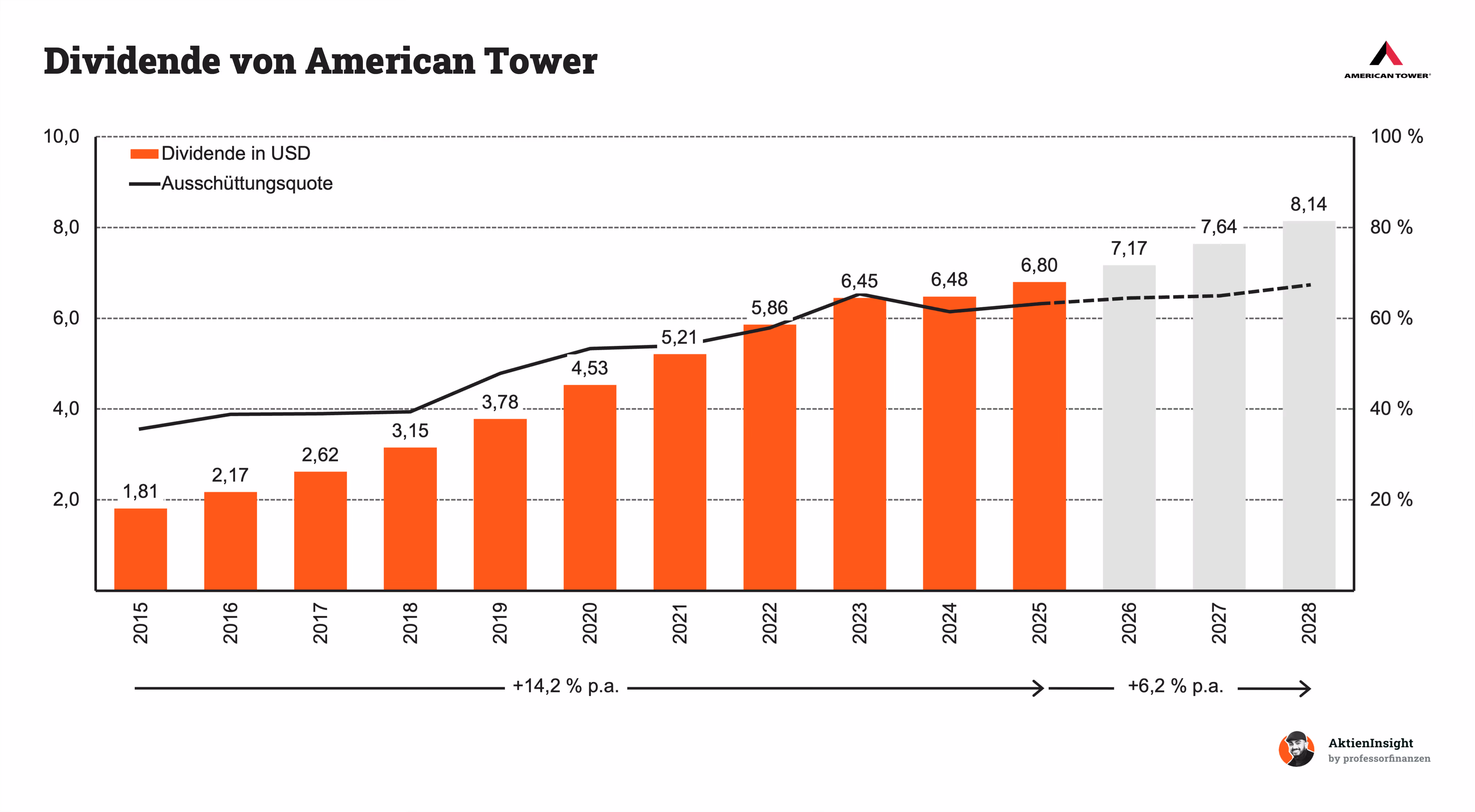 Konsequente Dividendensteigerungen. American Tower gehört zu den wachstumsstärksten Dividendenzahlern im Infrastruktursektor. In den letzten zehn Jahren stieg die Ausschüttung von 1,81 USD je Aktie im Jahr 2015 auf 6,80 USD im Jahr 2025. Das entspricht einem durchschnittlichen Wachstum von rund 14,2 % pro Jahr. Für die kommenden Jahre erwarten Analysten ein moderateres Wachstum von etwa 6,2 % jährlich.