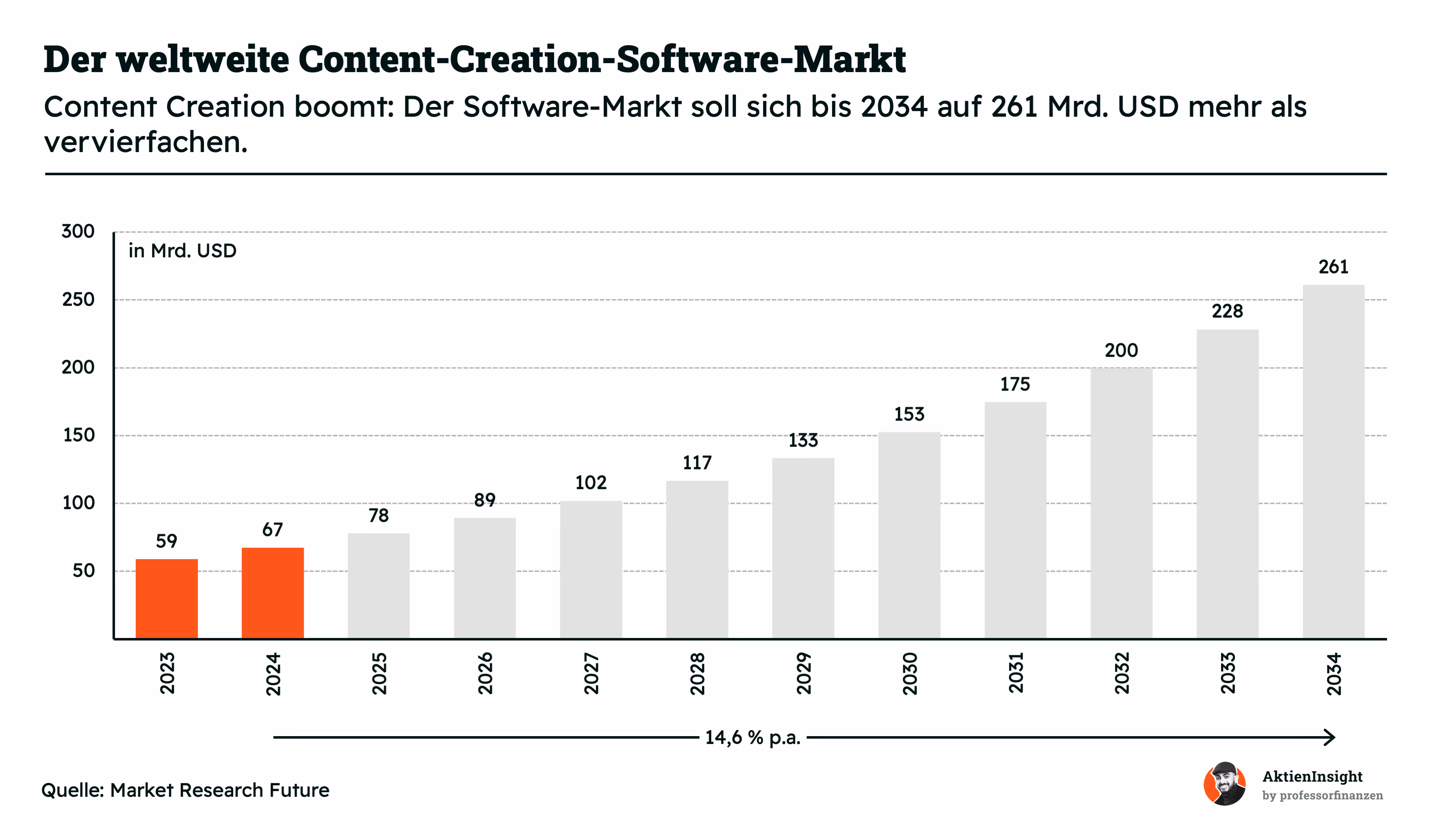 Der globale Markt für Content-Creation-Software wächst mit 14,6 % pro Jahr und soll bis 2034 ein Volumen von 261 Mrd. USD erreichen. 2024 lag der Markt noch bei 67 Mrd. USD. Damit gehört die Branche zu den wachstumsstärksten im gesamten Softwarebereich. Der Bedarf an digitalen Inhalten steigt rasant — in Unternehmen, Medienhäusern, Bildungseinrichtungen und bei privaten Creators.