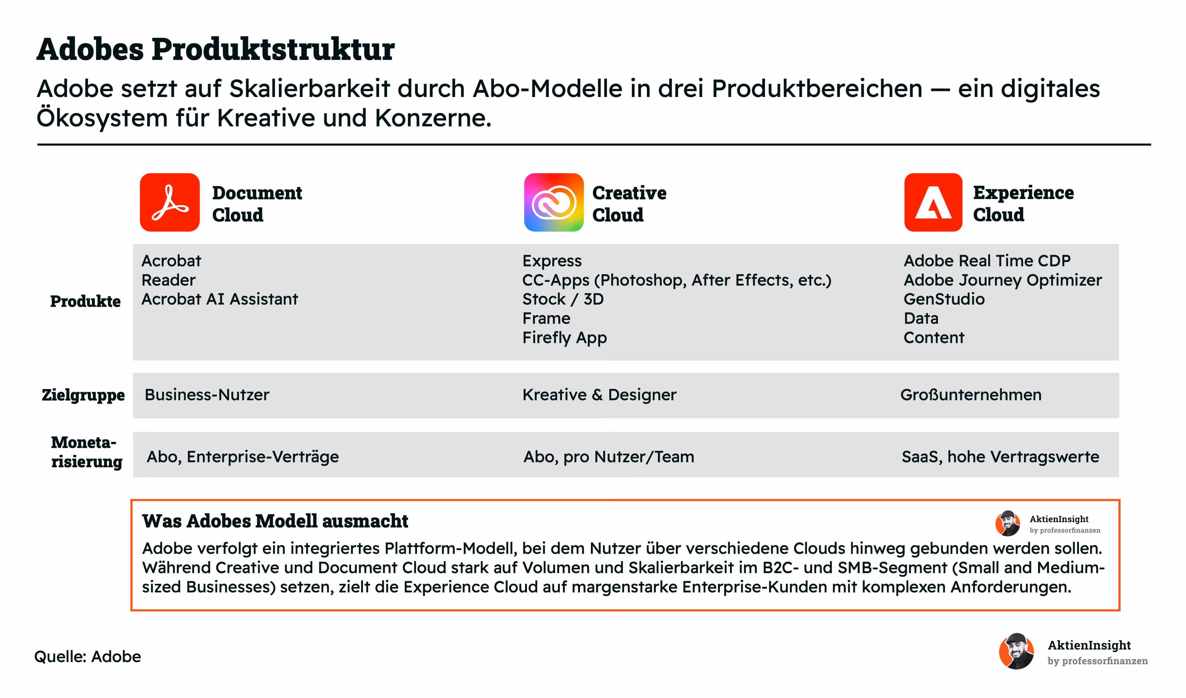Adobe steckt überall drin: vom Instagram-Post über den PDF-Vertrag bis zum KI-generierten Werbespot. Auf den ersten Blick wirkt das wie Software-Allerlei. Doch dahinter steckt ein extrem profitables Abo-Modell mit klarer Struktur: Creative Cloud, Document Cloud und Experience Cloud. Wer da nicht genauer hinschaut, übersieht einen der größten Gewinner der digitalen Transformation.