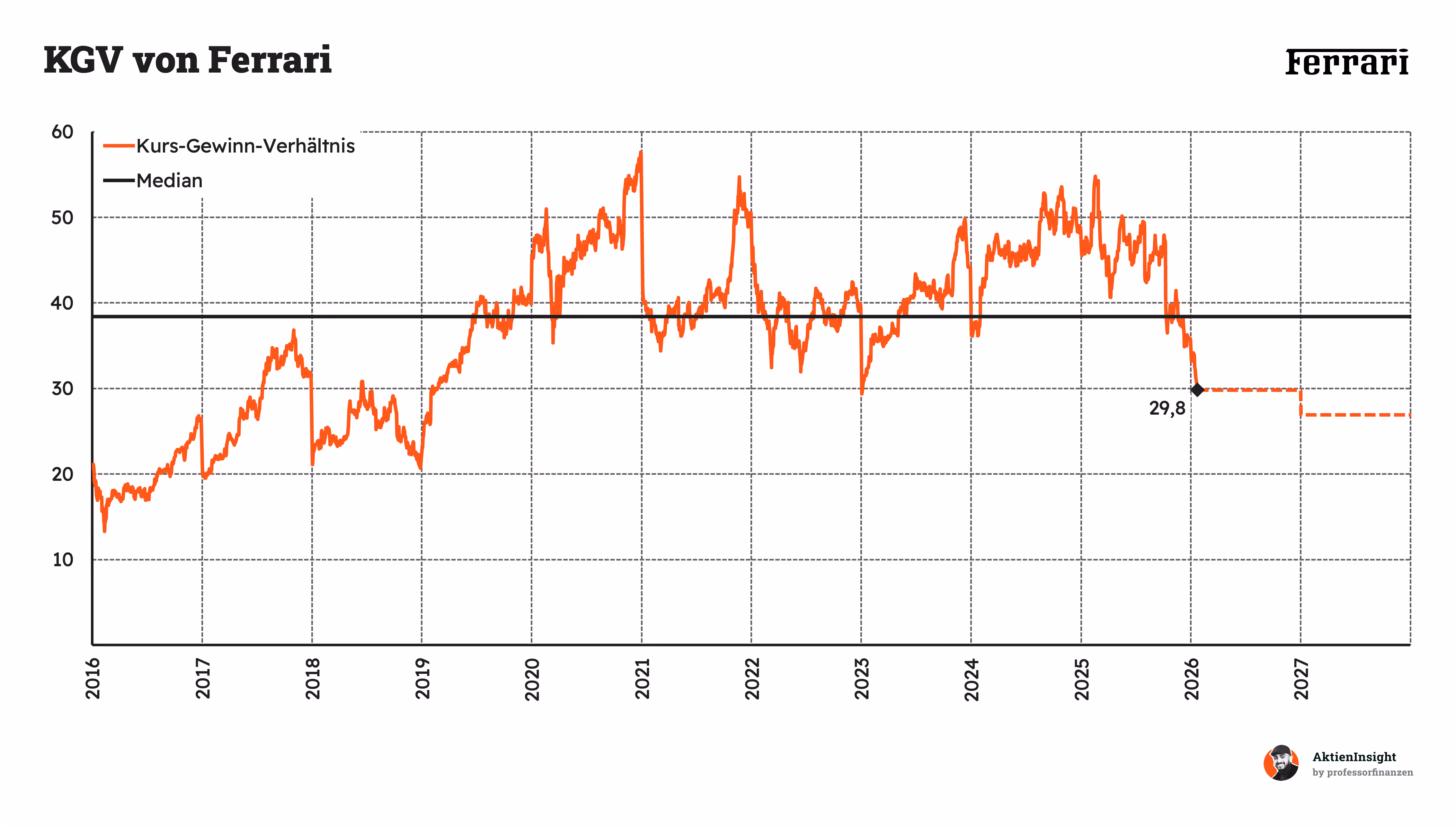 Finanziell ist Ferrari ein echtes „Margen-Monster“ und erreicht im AktienInsight-Rating die volle Punktzahl von 9 von 9 Punkten. Die EBIT-Marge von 28,2 % und ein ROCE von über 25 % zeigen, wie effizient das Unternehmen arbeitet. Die Bewertung ist aktuell sogar recht verlockend. Mit einem KGV von rund 30 liegt die Aktie unter ihrem historischen Durchschnitt von 38. Man bekommt hier also höchste Qualität zu einem Preis, der im Vergleich zur eigenen Geschichte fast schon einen Rabatt bietet.