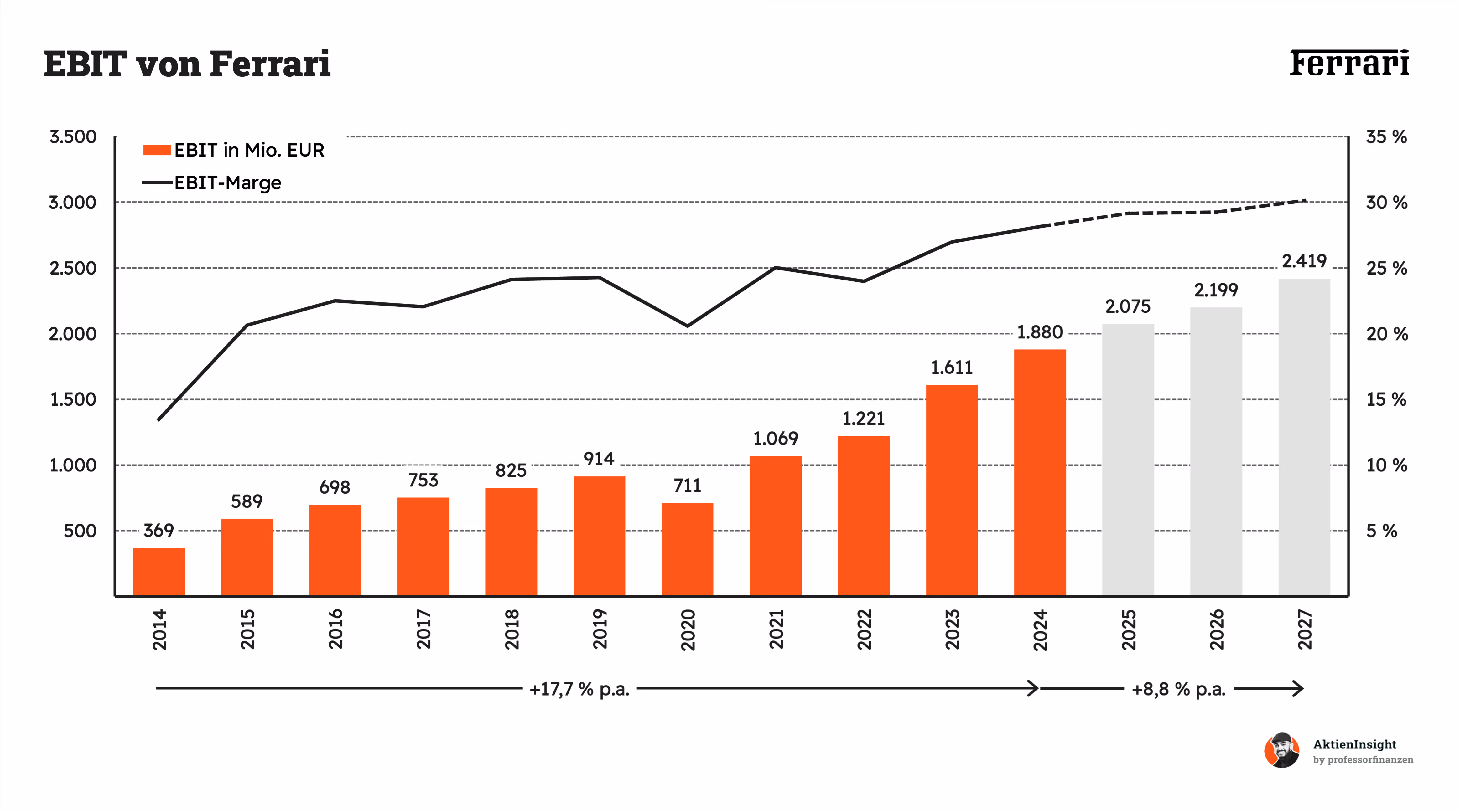 Bis 2027 soll das EBIT jährlich um weitere 8,8 % klettern und dann bei über 2,4 Milliarden Euro landen. Die Gewinnmarge soll dabei sogar die magische Grenze von 30 % knacken. Das ist für ein Unternehmen, das echte Luxusgüter produziert, ein absoluter Spitzenwert. Solche Prognosen sind bei Ferrari ziemlich glaubwürdig, weil die Marke fast immun gegen normale Wirtschaftskrisen ist.