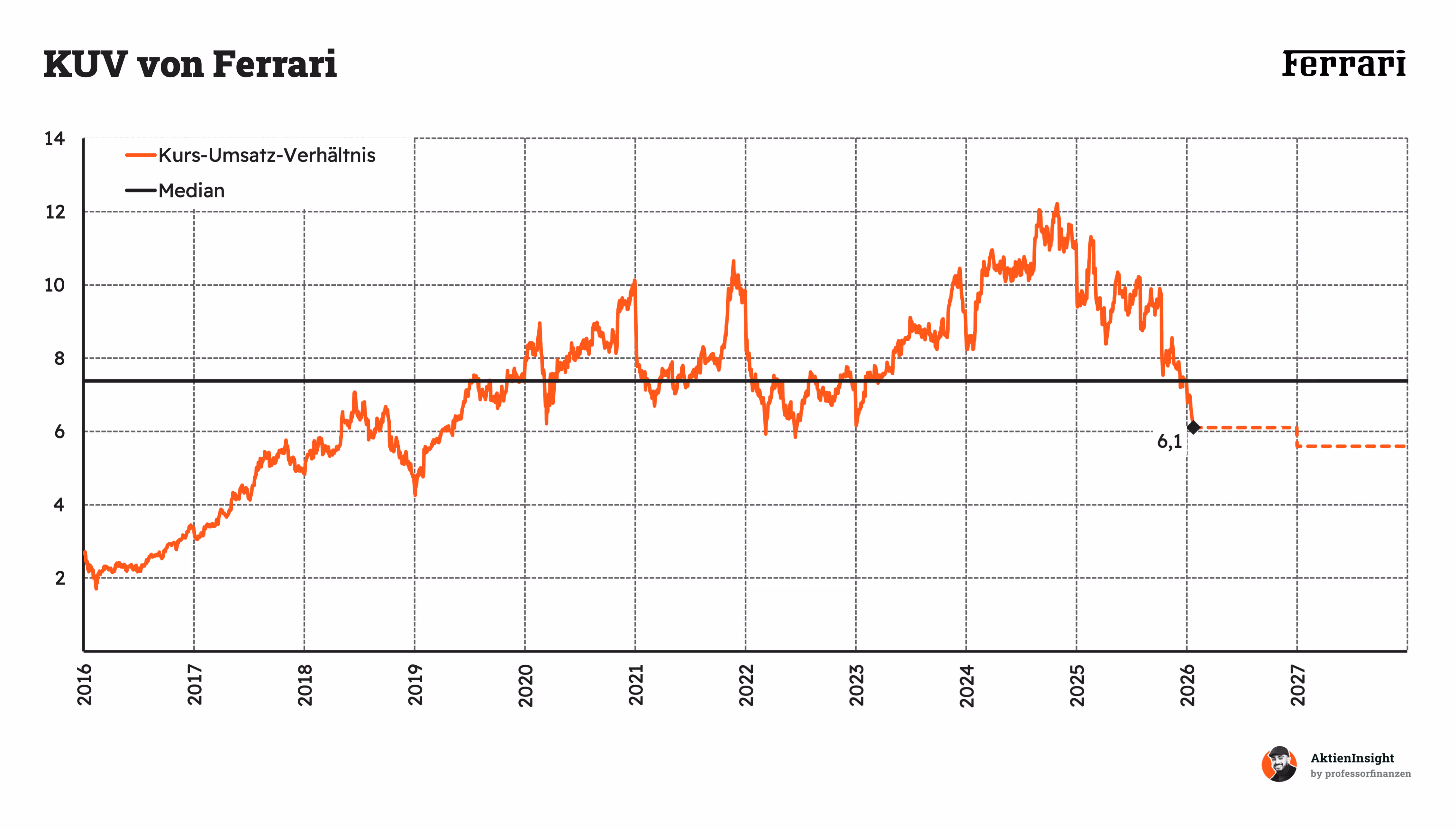 Ferraris Kurs/Umsatz-Bewertung liegt aktuell bei 6,1 und damit sogar unter dem langjährigen Median von 7,7. Das bedeutet, dass die Aktie im Vergleich zu ihrer eigenen Geschichte gerade mit einem Rabatt von etwa 20 % gehandelt wird. Seit 2016 ist dieses Multiple massiv gestiegen, weil die Börse Ferrari nicht mehr als gewöhnlichen Autobauer, sondern als exklusive Luxusmarke bewertet. Ende 2024 gab es einen extremen Ausreißer nach oben auf über 12, was an einer Phase purer Euphorie lag, in der die Aktie fast schon heißgelaufen war.