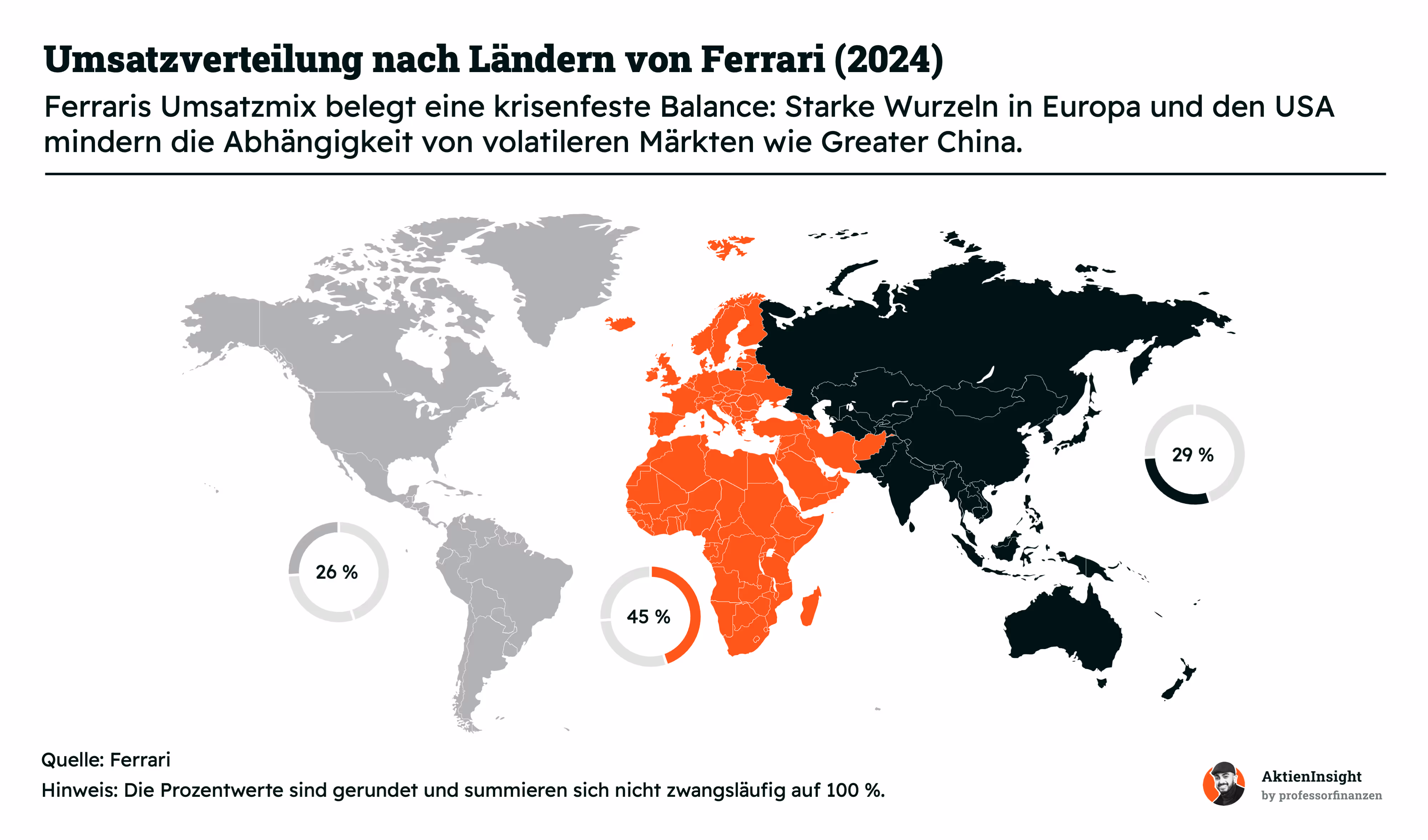 Nachdem wir geklärt haben, was Ferrari verkauft, stellt sich die Frage: Wo auf der Welt fahren diese Autos eigentlich? Ferrari ist zwar eine italienische Marke, aber ihr Erfolg ist weltweit verteilt. Das Unternehmen achtet sehr genau auf eine gesunde Mischung. Diese geografische Balance schützt Ferrari vor Krisen in einzelnen Ländern.