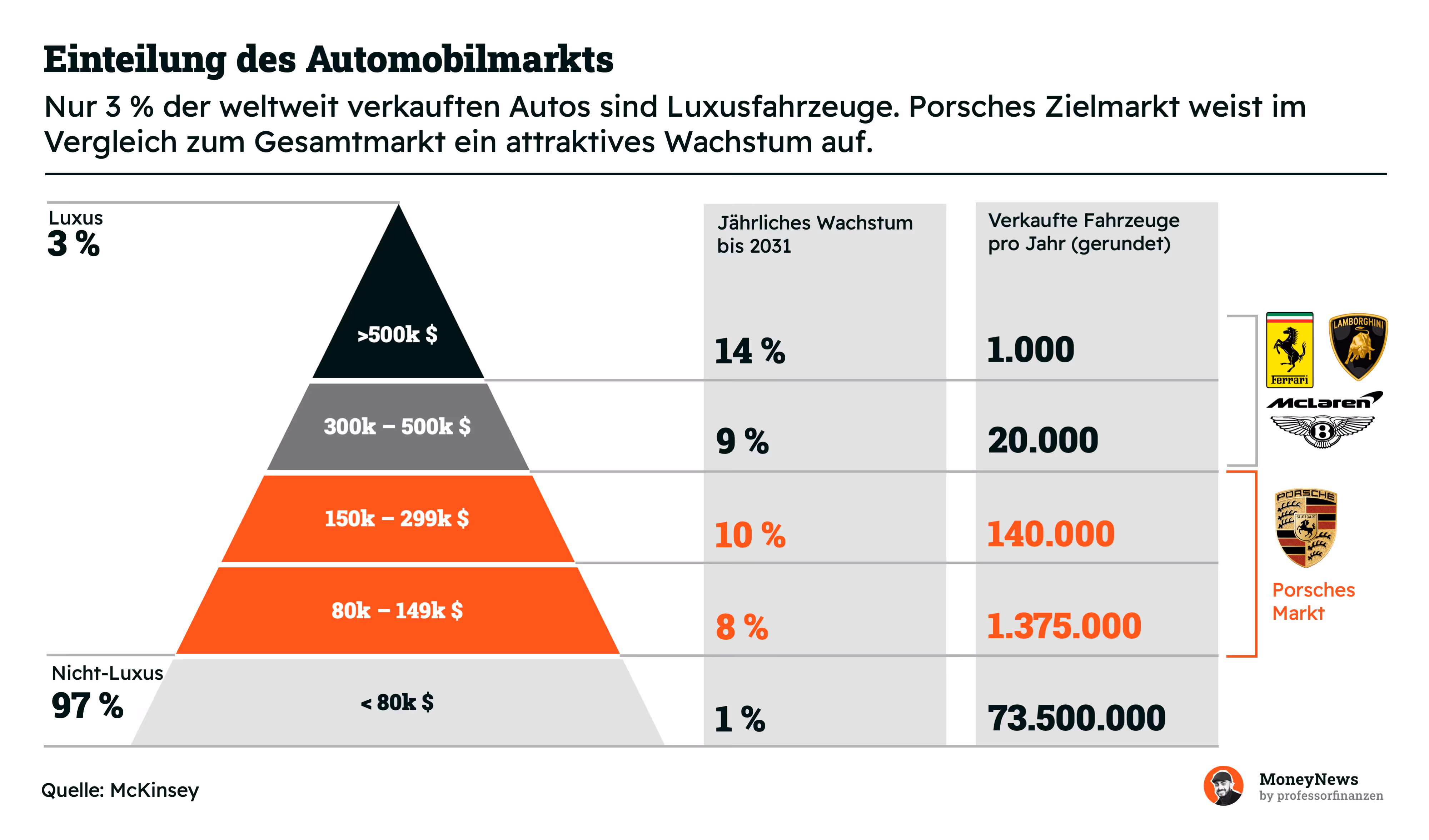 Porsche besetzt das Segment des Premium-Luxus und kombiniert Sportwagen-Performance mit Alltagstauglichkeit. Das Unternehmen produziert neben Ikonen wie dem 911 vor allem volumenstarke SUVs wie den Macan und den Cayenne. Damit zielt Porsche auf eine breitere Käuferschicht ab als reine Ultra-Luxus-Marken.