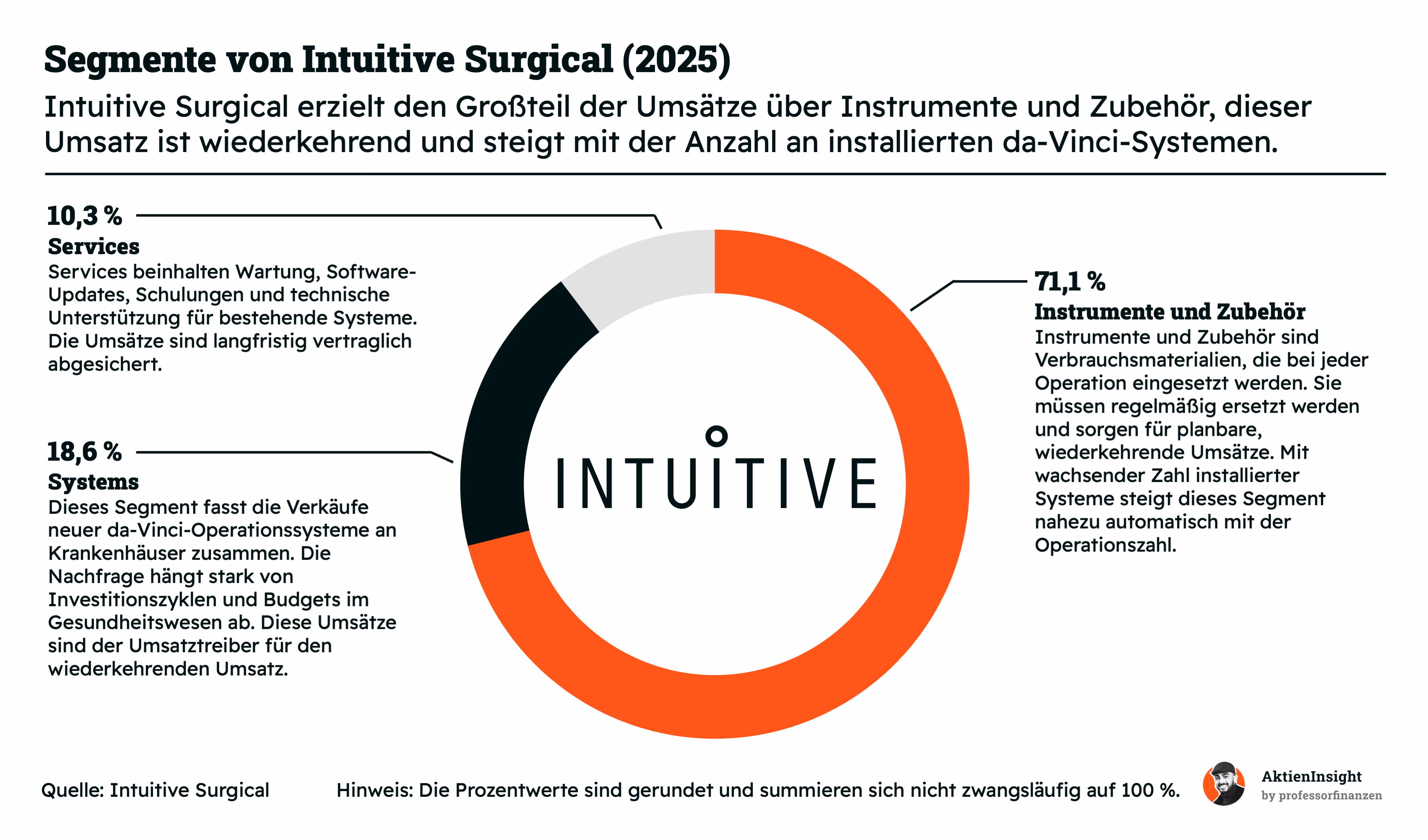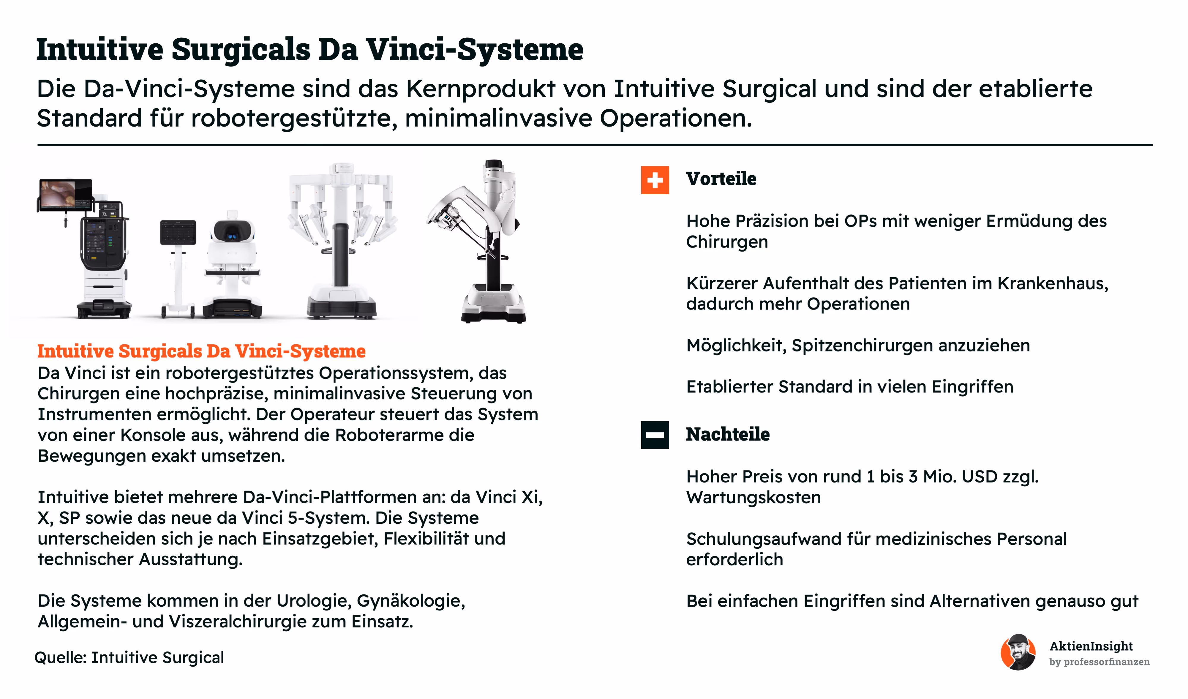 Systeme. Hier geht es um den Verkauf neuer Da-Vinci-Operationssysteme an Krankenhäuser. Diese Erlöse sind zyklischer. Sie hängen von Investitionsbudgets und Entscheidungsprozessen im Gesundheitswesen ab. Außerdem regulieren Gesundheitsbehörden wie die amerikanische FDA oder europäische EMA, wann und ob die Geräte auf den Markt kommen dürfen.