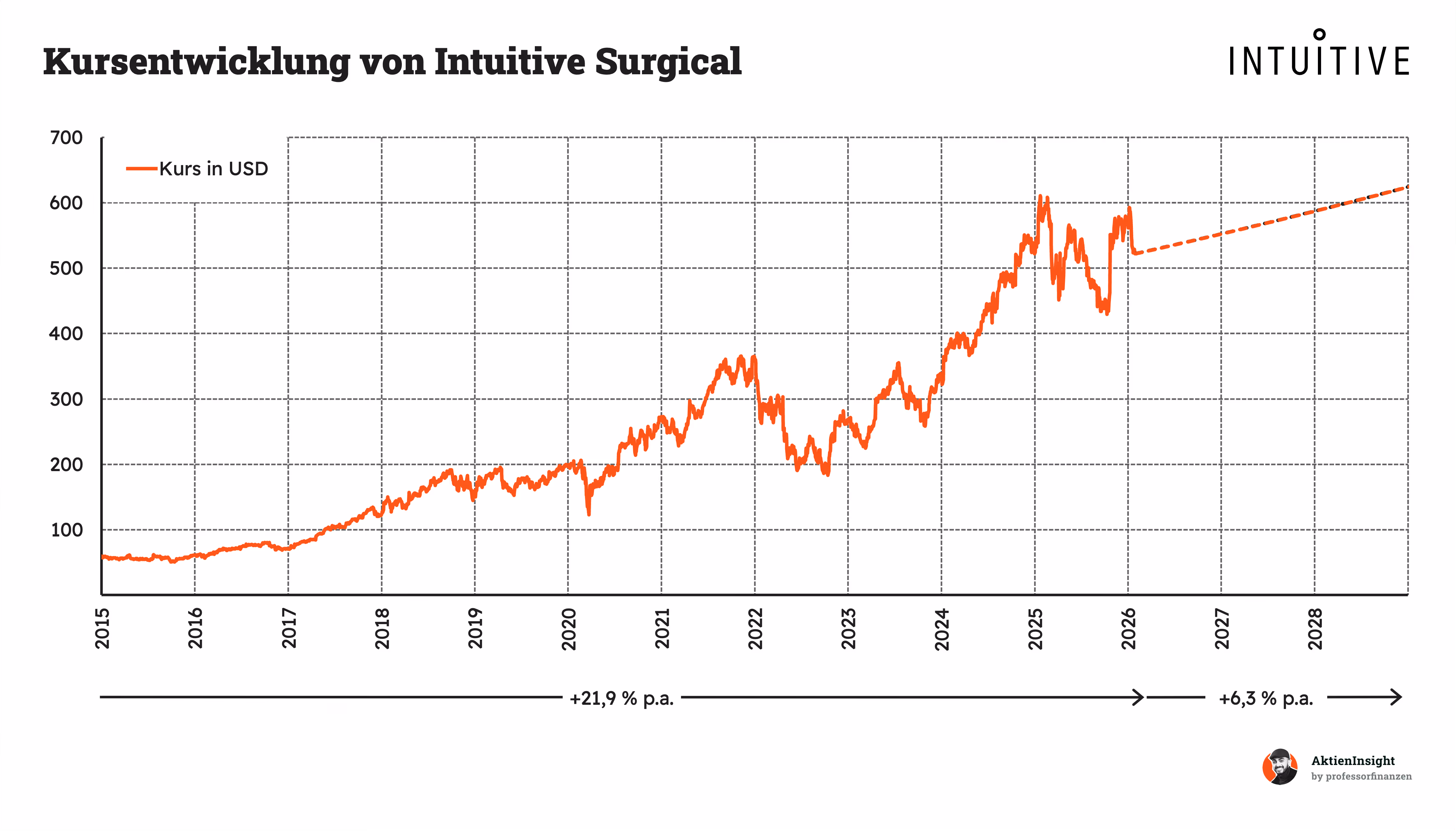 Wir finden die Intuitive-Surgical-Aktie haltenswert. Wir rechnen mit einer jährlichen Rendite von etwa 6,3 % beim aktuellen Kurs von 522 US-Dollar. Intuitive Surgical bietet ein außergewöhnlich starkes Geschäftsmodell, hohe Margen und eine dominante Marktstellung. Gleichzeitig lässt die Bewertung wenig Raum für Enttäuschungen. Wir setzen die Aktie deshalb lieber auf die Watchlist, falls sie in der Zukunft fällt, denn wir sehen die Qualität in der Firma.