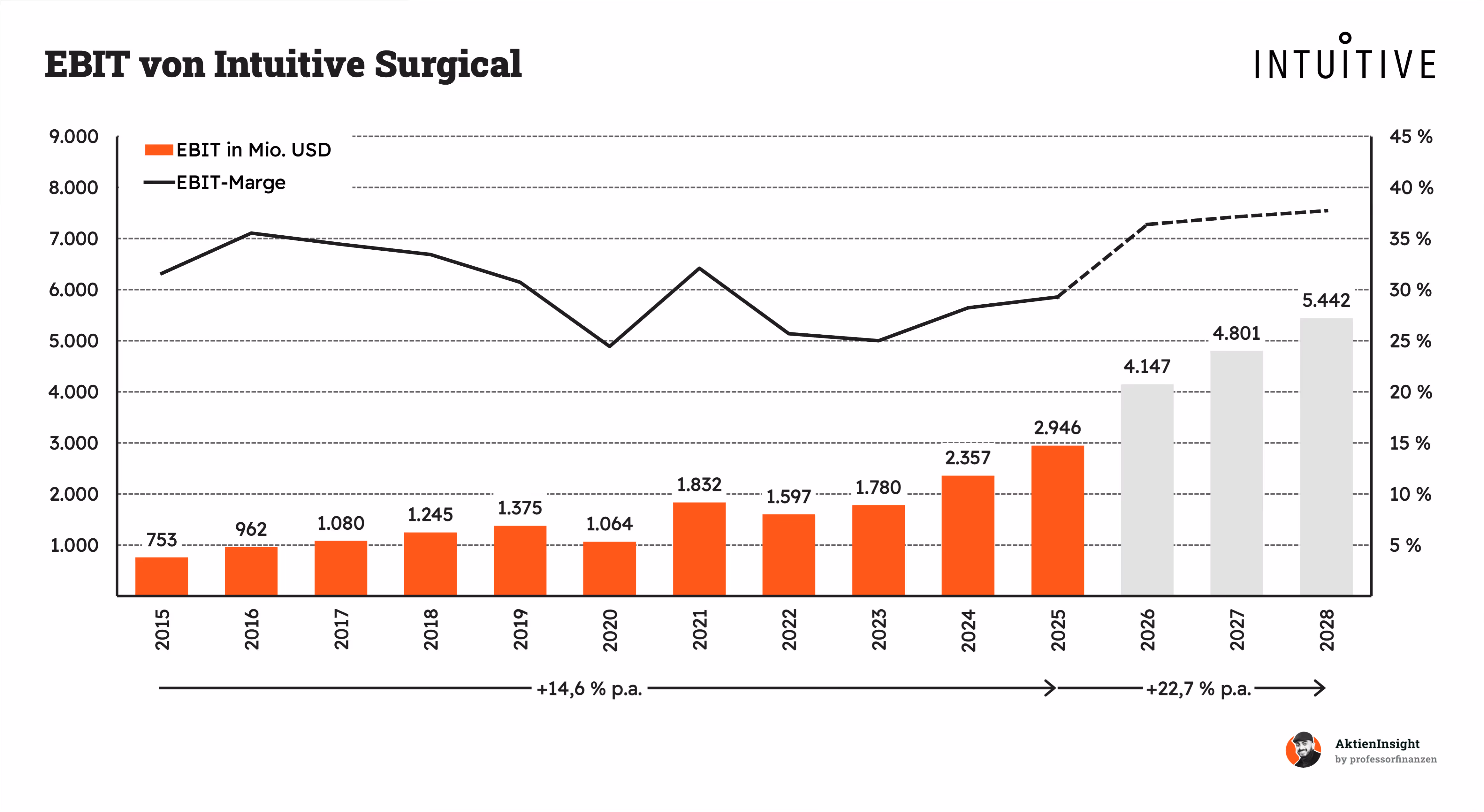 Die Anzahl der Operationen mit Systemen von Intuitive Surgical wächst noch schneller als die Zahl der Geräte. 2015 lagen wir bei rund 650.000 Eingriffen pro Jahr. 2025 sind es fast 3,2 Millionen. Das entspricht einem jährlichen Wachstum von etwa 15 % im Vergleich zum Wachstum der Gerätezahl von 12 %. Auf den Systemen werden im Schnitt 5 % mehr Operationen pro Jahr durchgeführt.