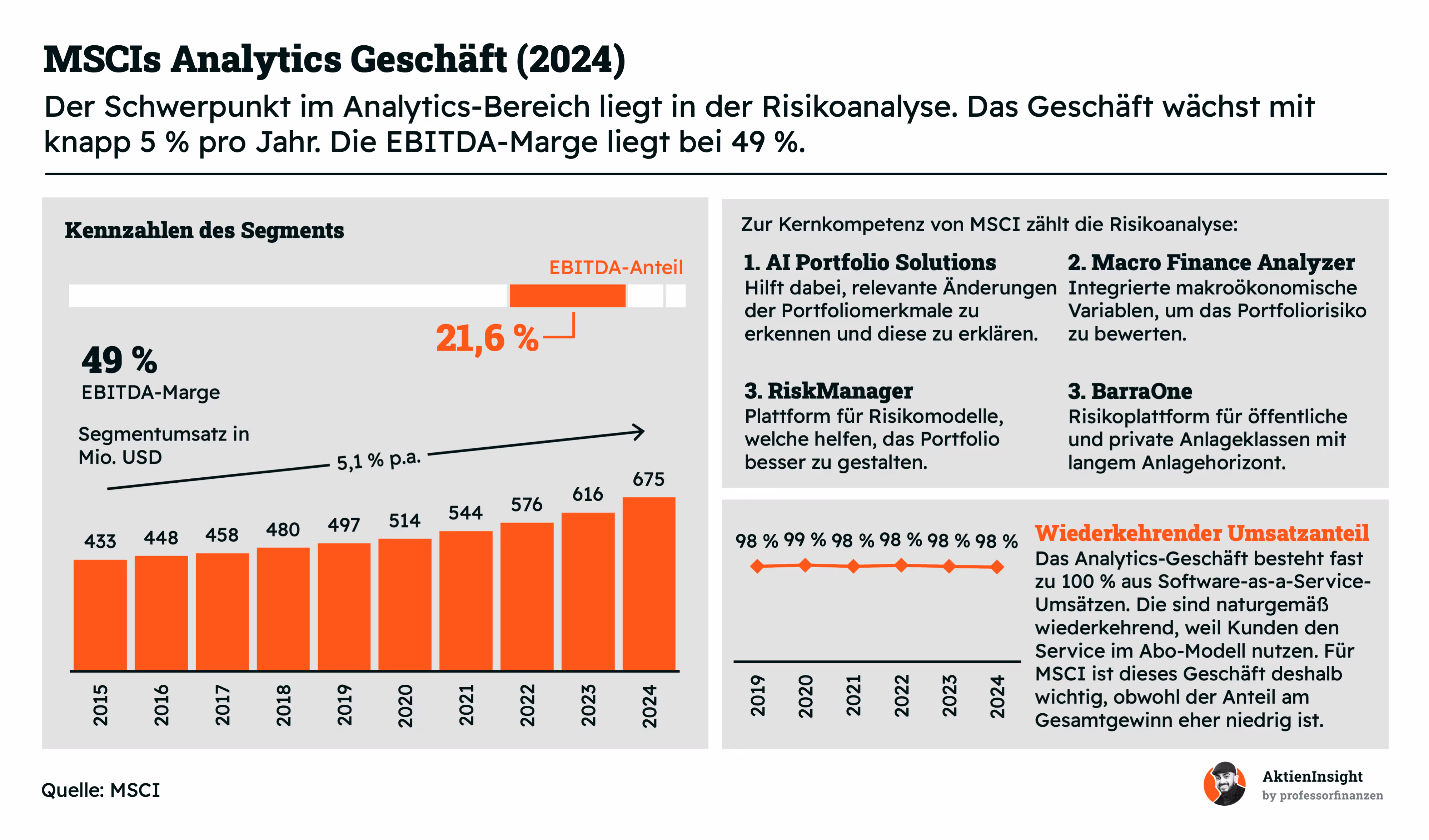 Das Analysegeschäft bietet Tools zur Risiko- und Performanceanalyse, die es Investoren ermöglichen, ihre Portfolios zu überwachen und Risiken über verschiedene Anlageklassen hinweg zu bewerten. Diese Tools unterstützen auch bei der Einhaltung von regulatorischen Anforderungen und helfen, sowohl kurzfristige als auch langfristige Risiken zu identifizieren. Kunden zahlen Abonnements für den Zugang zu diesen Plattformen, die von institutionellen Investoren und Banken verwendet werden, um ihre Portfolios zu optimieren.
