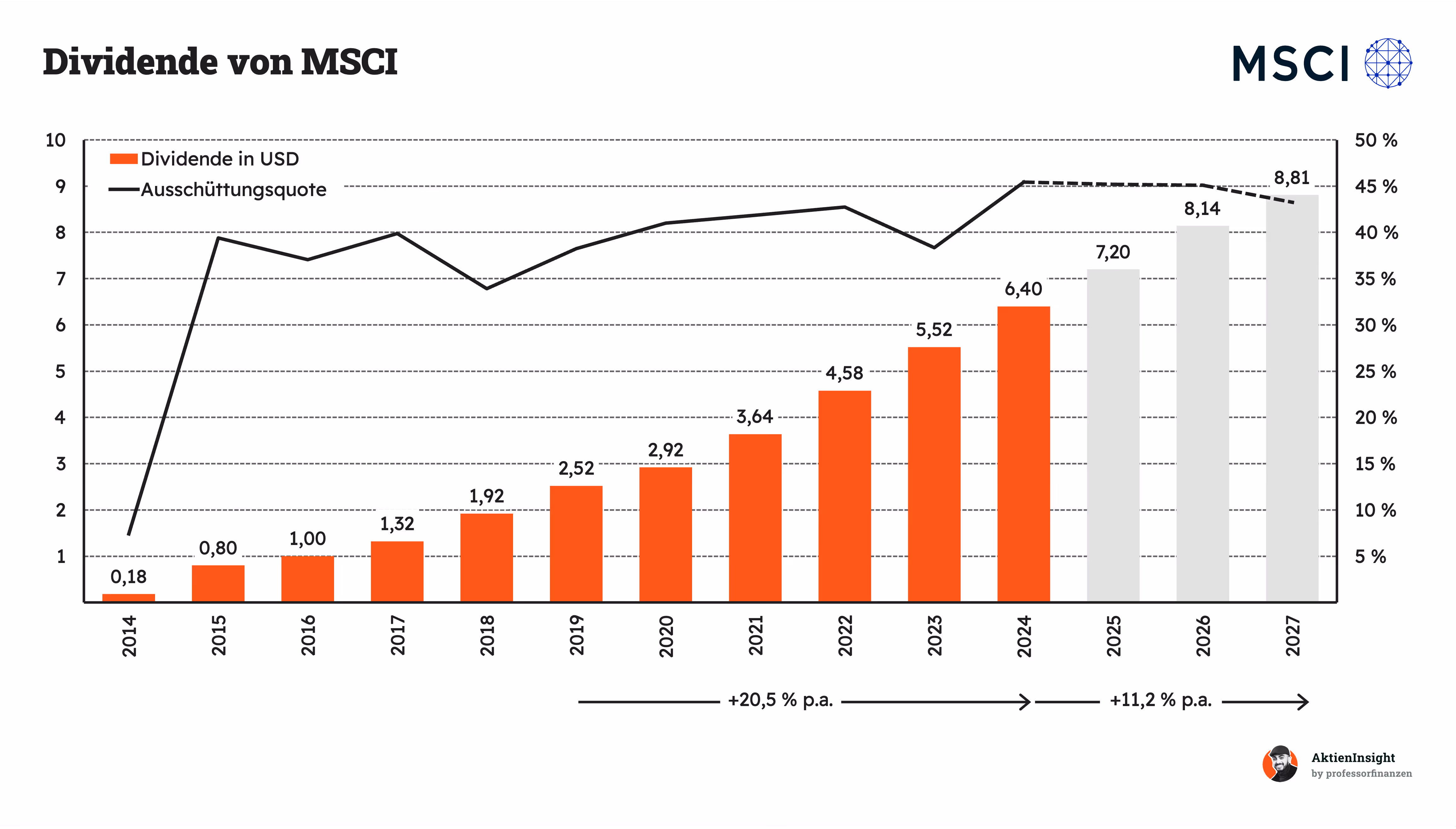 MSCIs Dividende ist in den letzten 10 Jahren um 42,9 % pro Jahr gestiegen. Allerdings gibt es eben auch erst seit 2014 eine Dividende. Und da zu dem Zeitpunkt noch wirklich wenig ausgeschüttet wurde, sind die 42,9 % nicht wirklich repräsentativ.
