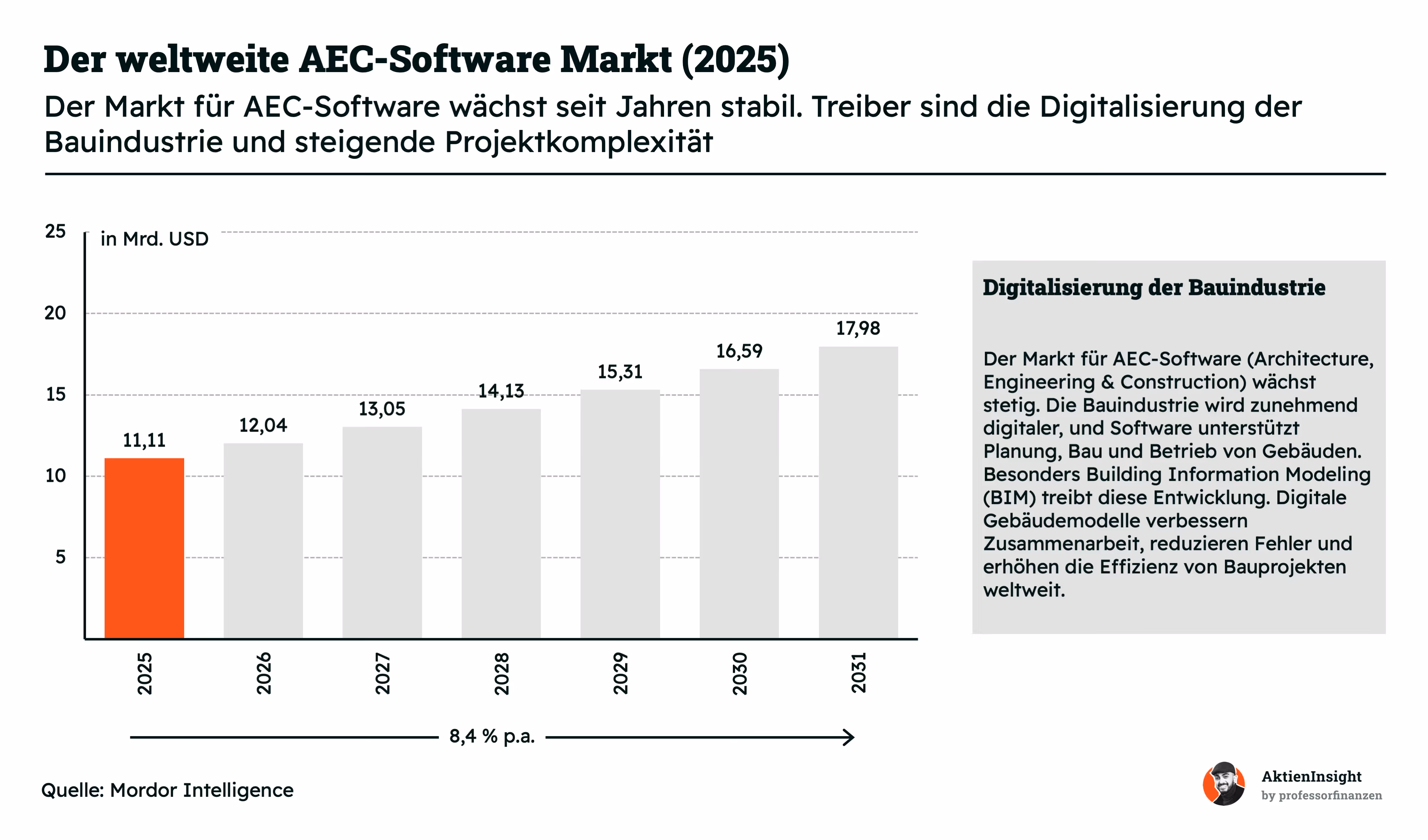 Der Markt für AEC Software umfasst digitale Lösungen für Architektur, Ingenieurwesen und Bau. Dazu gehören Programme für Planung, Modellierung, Projektmanagement und Gebäudebetrieb. Weltweit liegt das Marktvolumen aktuell bei rund 11,1 Mrd. USD. Bis 2031 soll der Markt auf etwa 18 Mrd. USD wachsen. Das entspricht einem durchschnittlichen Wachstum von rund 8,4 % pro Jahr.