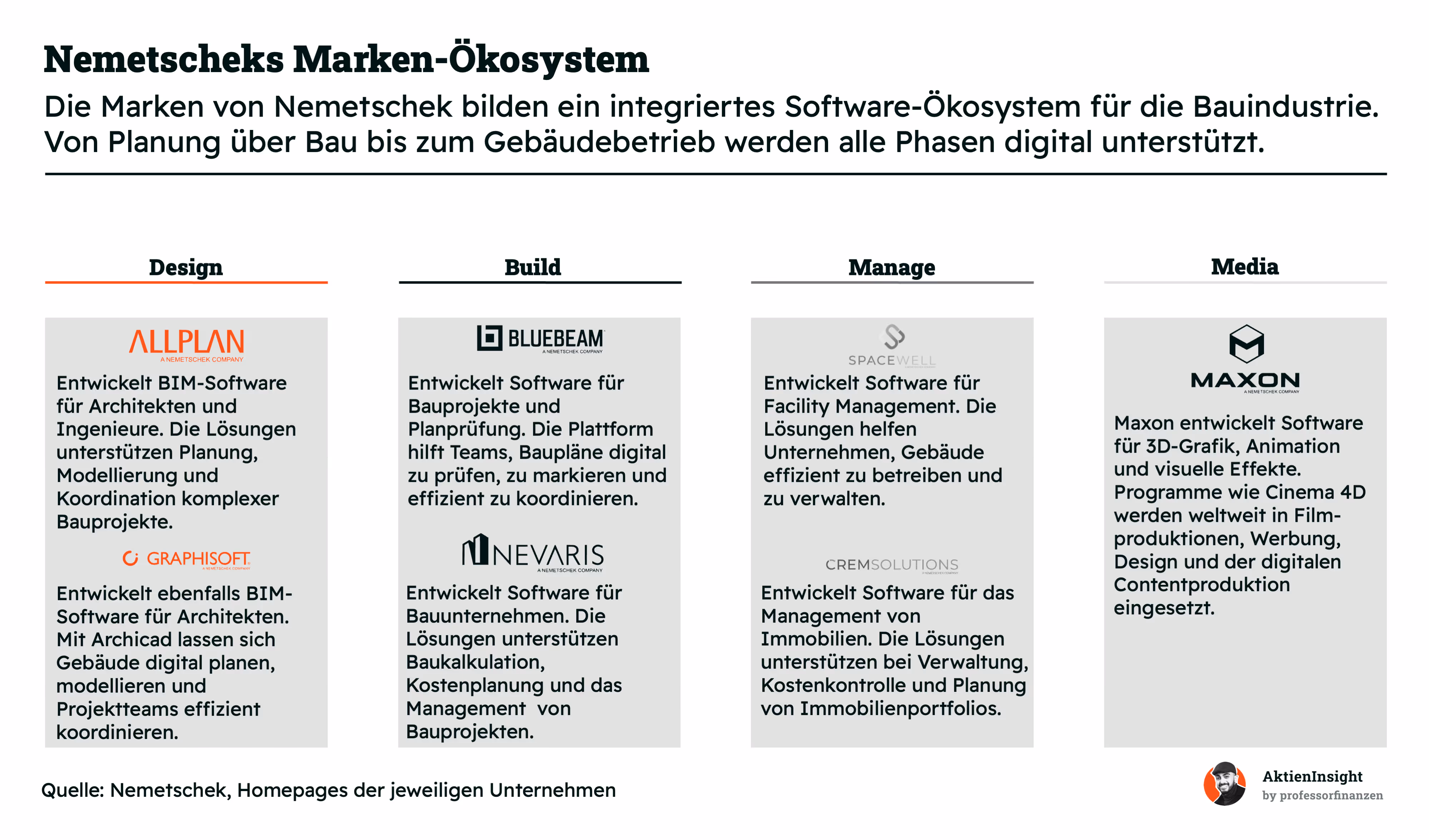 Ein zentraler Baustein des Geschäftsmodells ist das Marken Ökosystem von Nemetschek. Statt nur eine einzelne Software anzubieten, bündelt das Unternehmen mehrere spezialisierte Marken, die verschiedene Phasen im Bauprozess abdecken. Dazu gehören unter anderem Allplan und Graphisoft für die Planung, Bluebeam und Nevaris für die Bauausführung sowie Spacewell und Crem Solutions für den Gebäudebetrieb. Ergänzt wird das Portfolio durch Maxon im Bereich 3D Visualisierung.