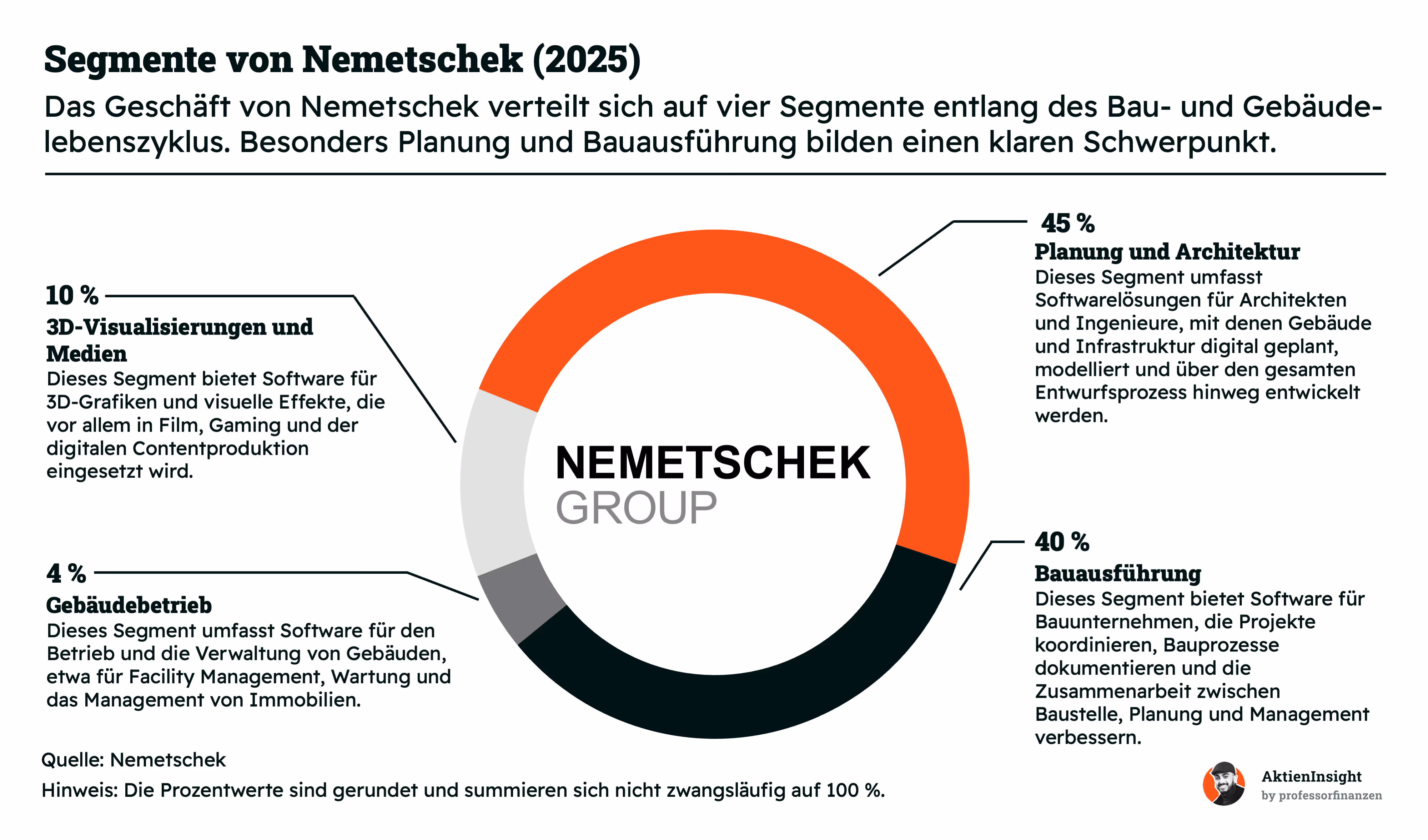 Nemetschek ist ein spezialisierter Softwareanbieter für die Bau- und Immobilienbranche. Das Unternehmen deckt mit seinen Lösungen den gesamten Lebenszyklus eines Gebäudes ab; von der Planung bis zum Betrieb. Besonders stark ist Nemetschek bei Architekten und Ingenieuren. Durch Marken wie Graphisoft oder Bluebeam entsteht ein breites Ökosystem mit hoher Kundenbindung und wiederkehrenden Umsätzen von über 90 %.