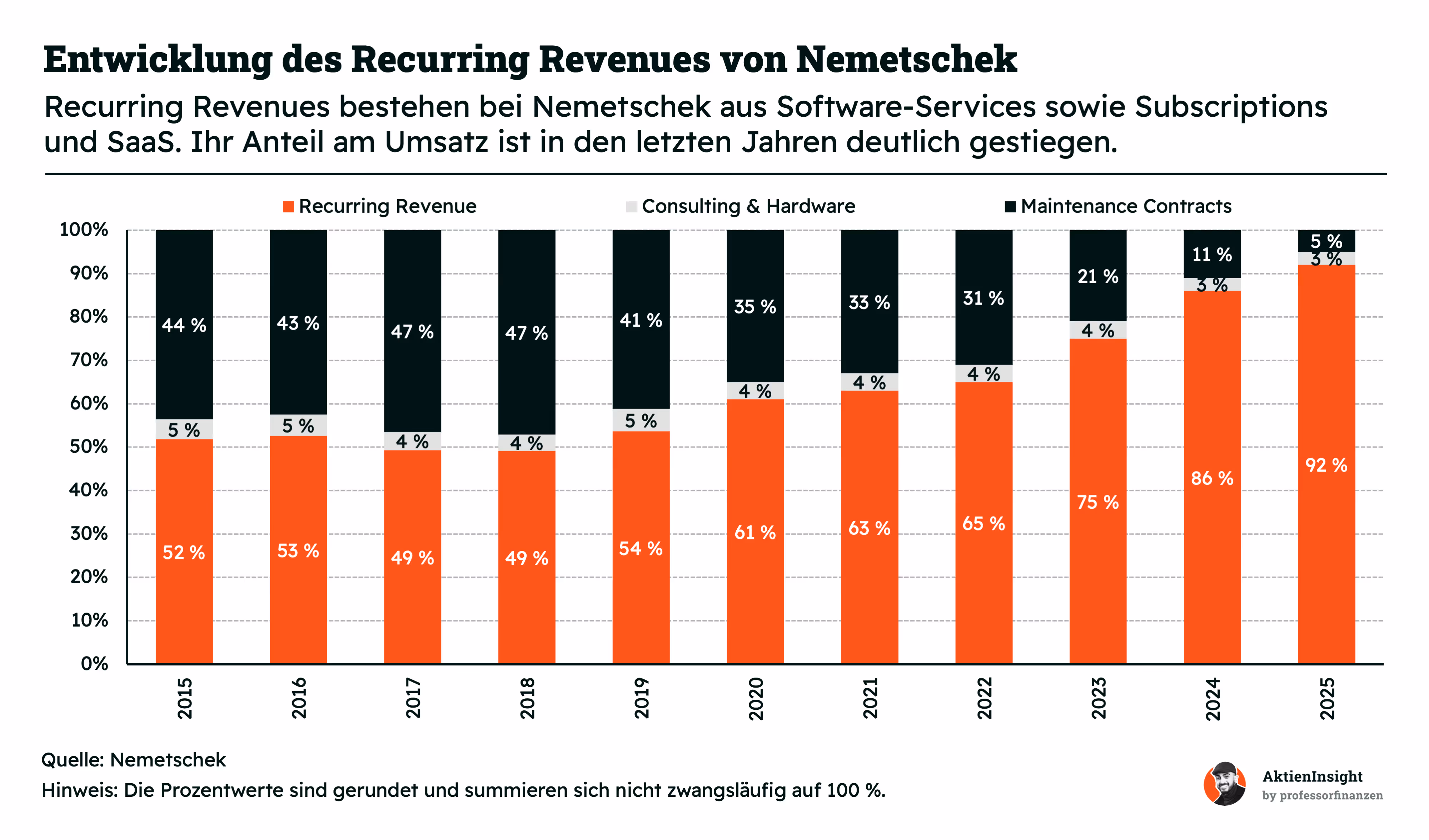 wiederkehrender Umsätze. Nemetschek verdient heute den Großteil seines Geldes über Abonnements, Cloudlösungen und Software Services. Der Anteil dieser wiederkehrenden Erlöse ist in den letzten Jahren stark gestiegen. Lag er 2015 noch bei rund 52 %, erreicht er inzwischen über 90 %. Gleichzeitig ist der Anteil klassischer Lizenzverkäufe deutlich gesunken.