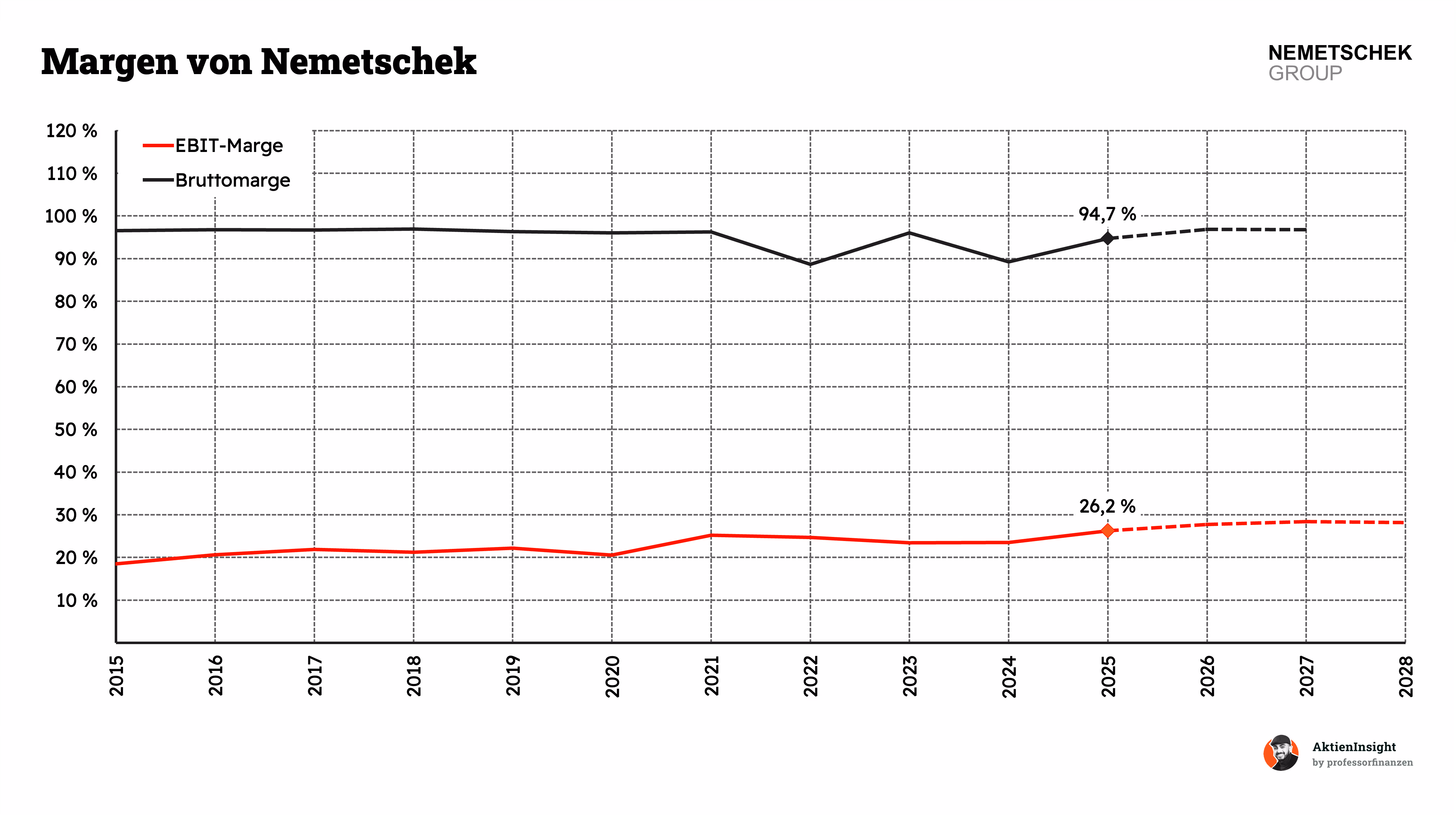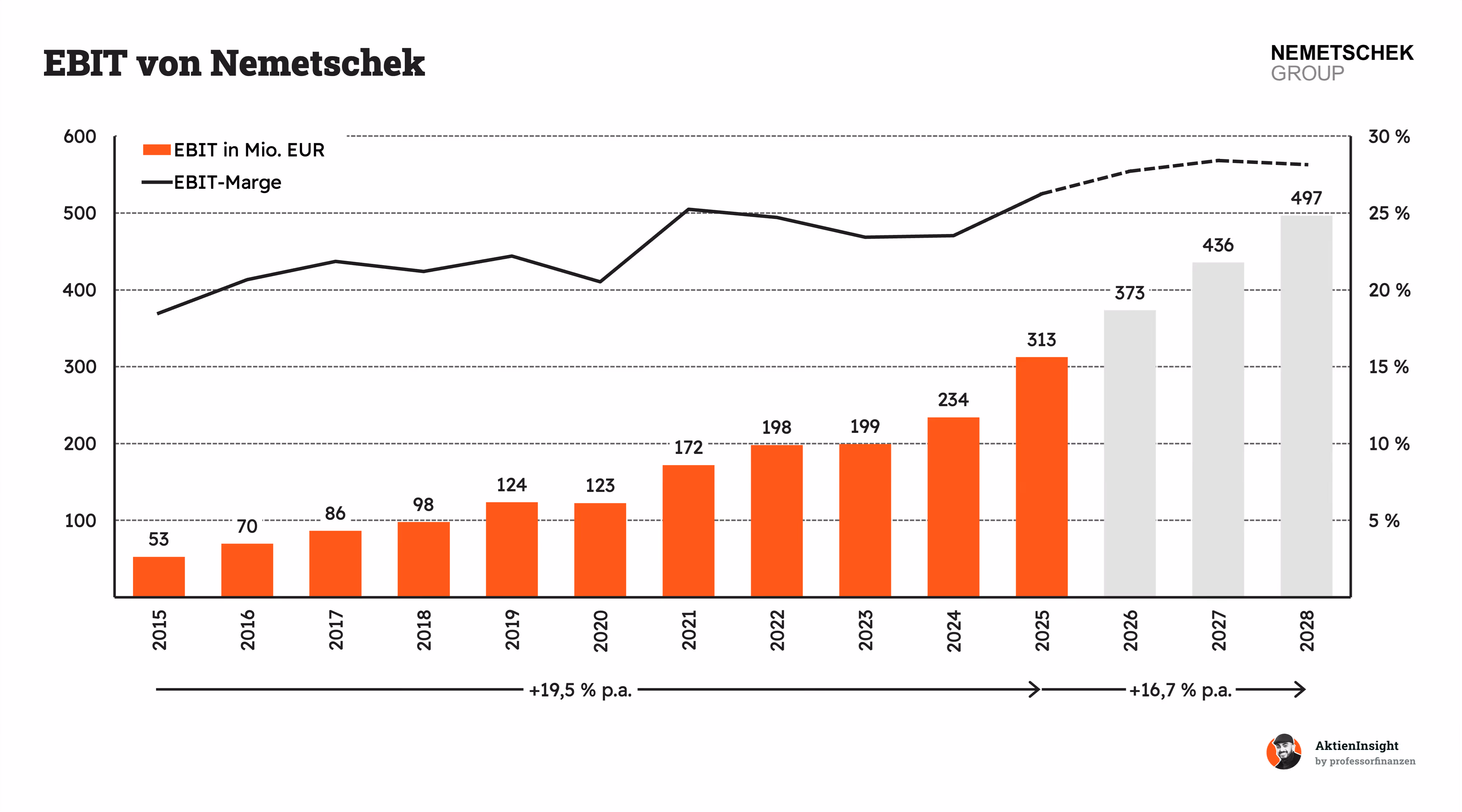 In den nächsten Jahren soll das EBIT mit rund 16,7 % pro Jahr weiter wachsen. Das ist etwas weniger als historisch, aber immer noch sehr stark. Bis 2028 könnte das EBIT auf knapp 500 Mio. Euro steigen. Gleichzeitig bleibt die Marge auf einem hohen Niveau von rund 27 bis 28 %. Das zeigt, wie profitabel das Geschäftsmodell ist.