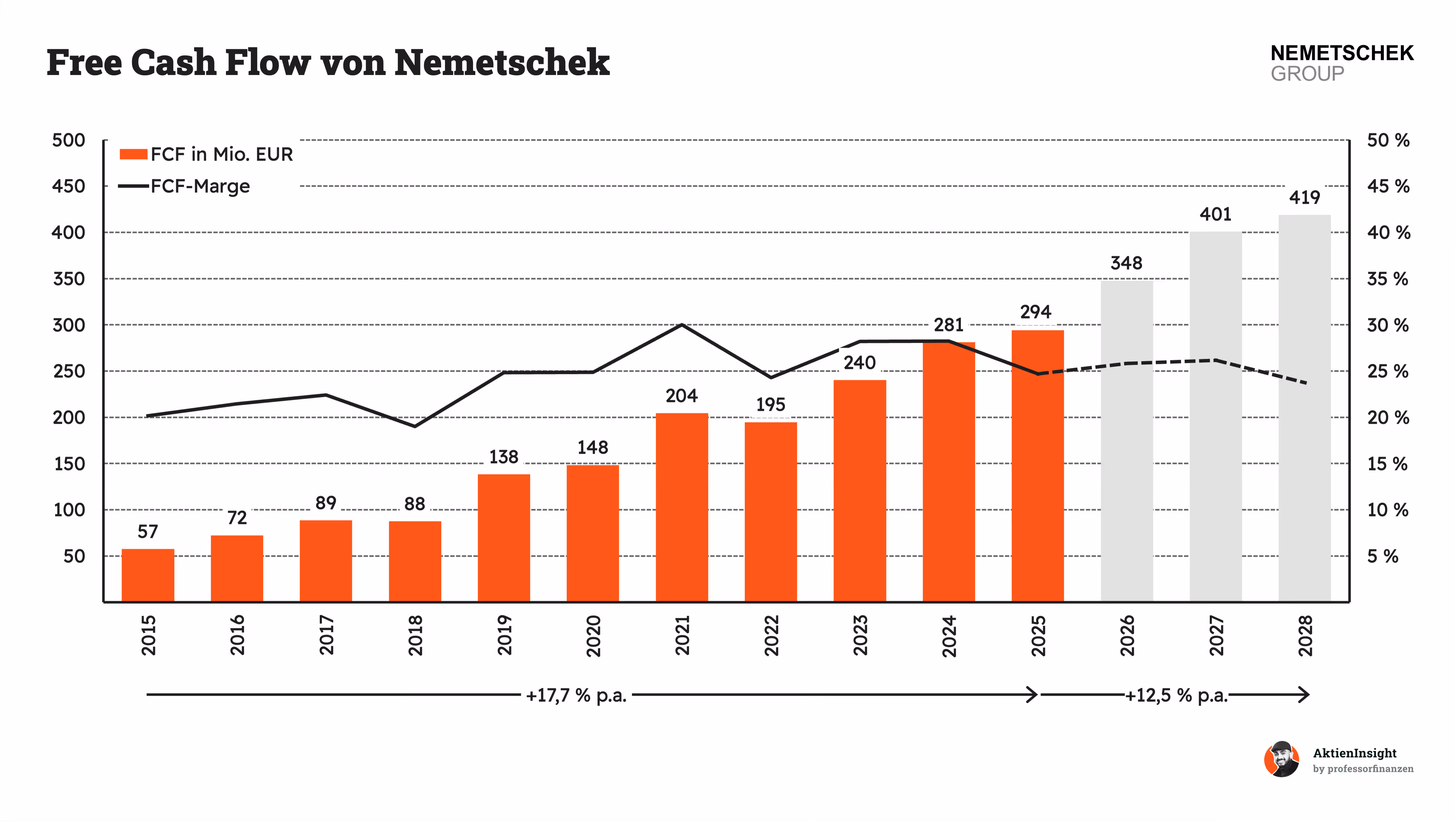 In den nächsten Jahren soll das Wachstum beim Free Cash Flow auf etwa 12,5 % pro Jahr zurückgehen. Das ist eine normale Entwicklung bei größer werdender Basis. Bis 2028 könnte der FCF auf über 400 Mio. Euro steigen. Die Marge bleibt dabei stabil im Bereich von rund 25 %. Das unterstreicht die hohe Cash-Generierung des Geschäftsmodells.