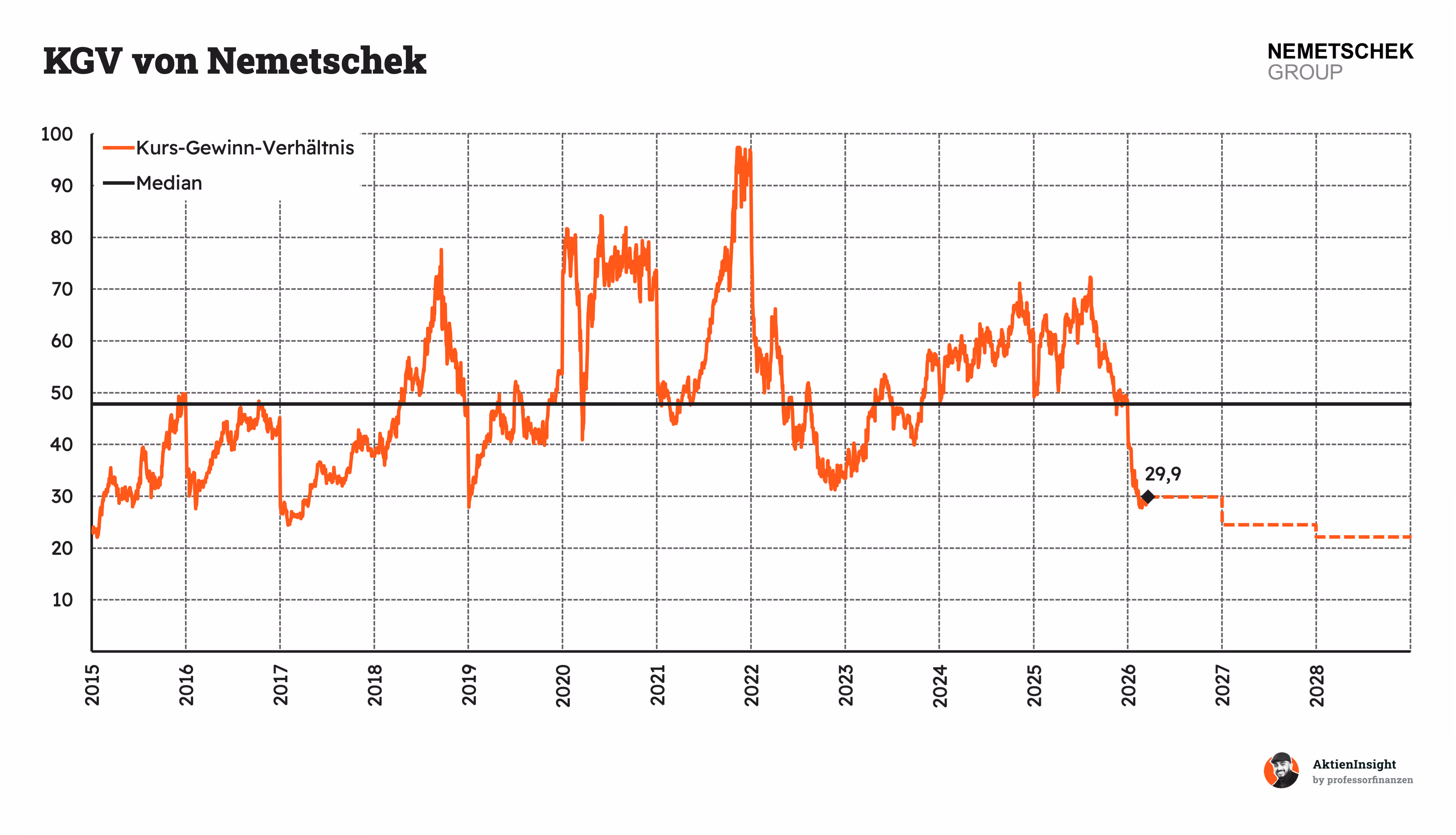 Das aktuelle KGV liegt bei etwa 29,9 und damit rund 37 % unter dem Median von 47,8. Auch auf Basis der Gewinne ist die Aktie damit deutlich günstiger als historisch üblich. In der Vergangenheit war Nemetschek häufig mit sehr hohen Gewinnmultiples bewertet, was die starke Marktstellung und Wachstumsfantasie widerspiegelt.