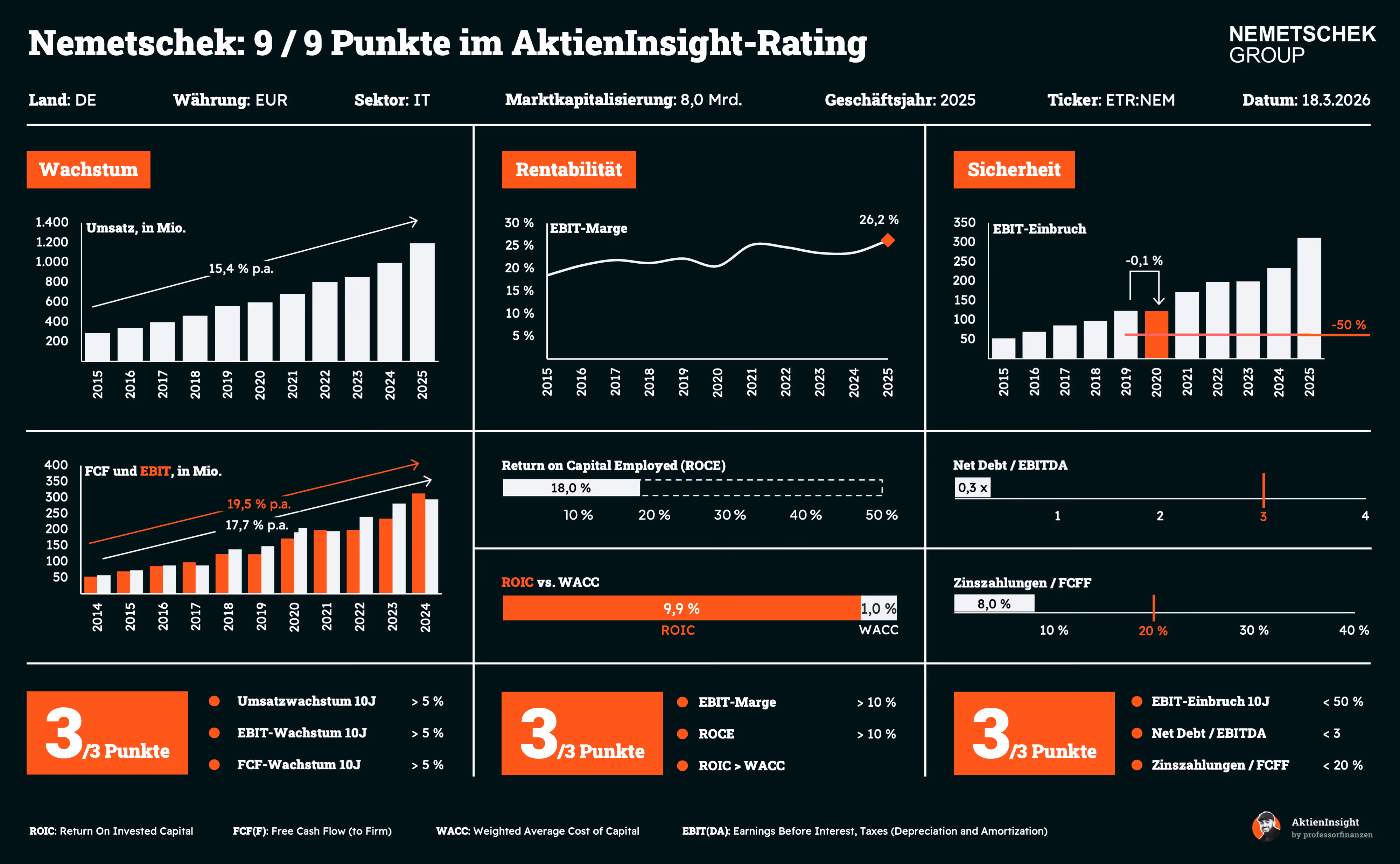 Die Rentabilität ist ebenfalls auf Top-Niveau. Die EBIT-Marge liegt bei rund 26 % und damit klar über der Mindestanforderung. Auch die Kapitalrenditen sind solide. Der ROCE erreicht etwa 18 %, während der ROIC mit knapp 10 % deutlich über den Kapitalkosten von rund 1 % liegt. Nemetschek erzielt damit in allen Rentabilitätskennzahlen die volle Punktzahl.