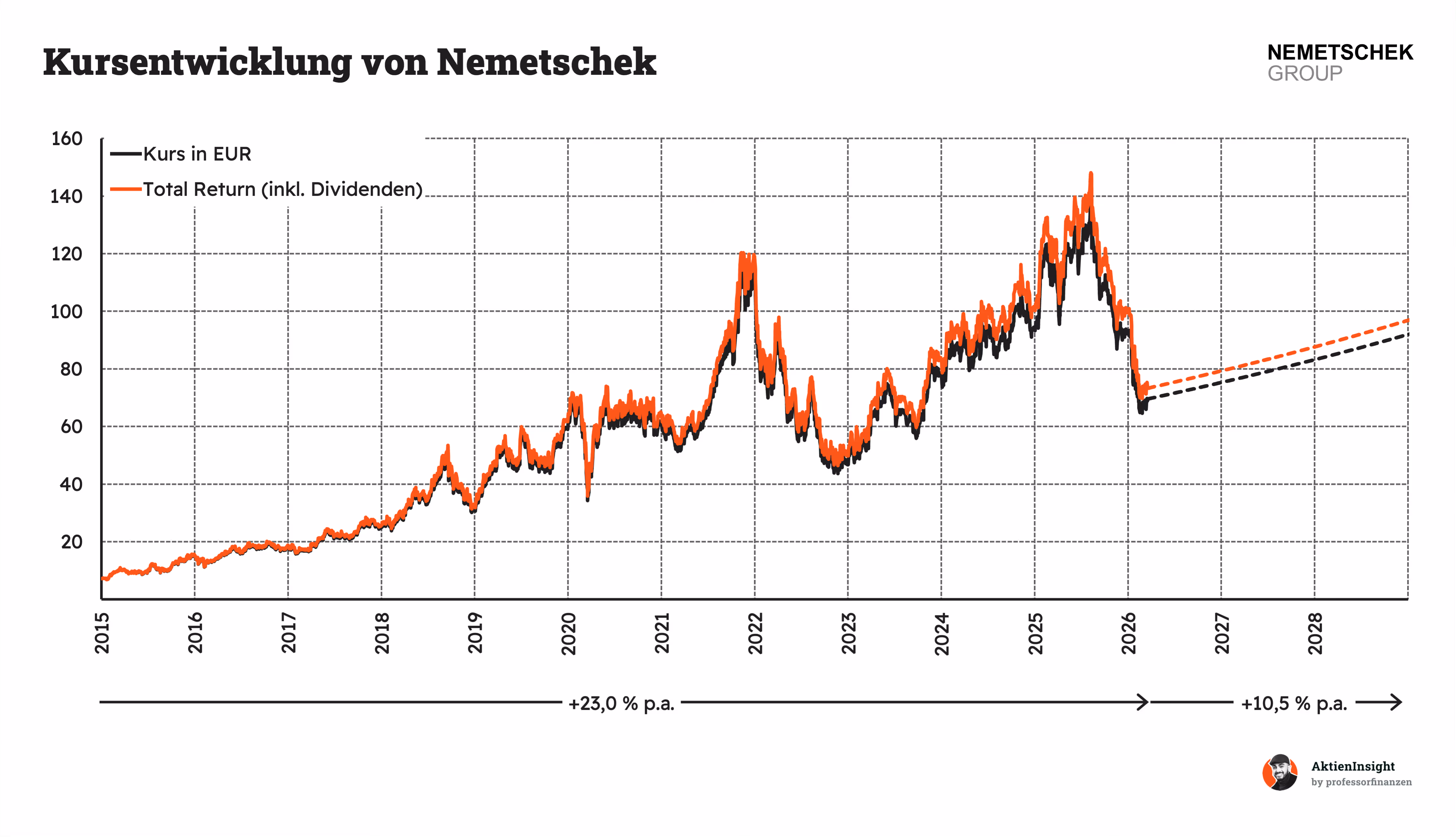 - Wir nehmen an, dass das KGV bei 40 liegt und Nemetschek weiterhin als Premium-Unternehmen bewertet wird.