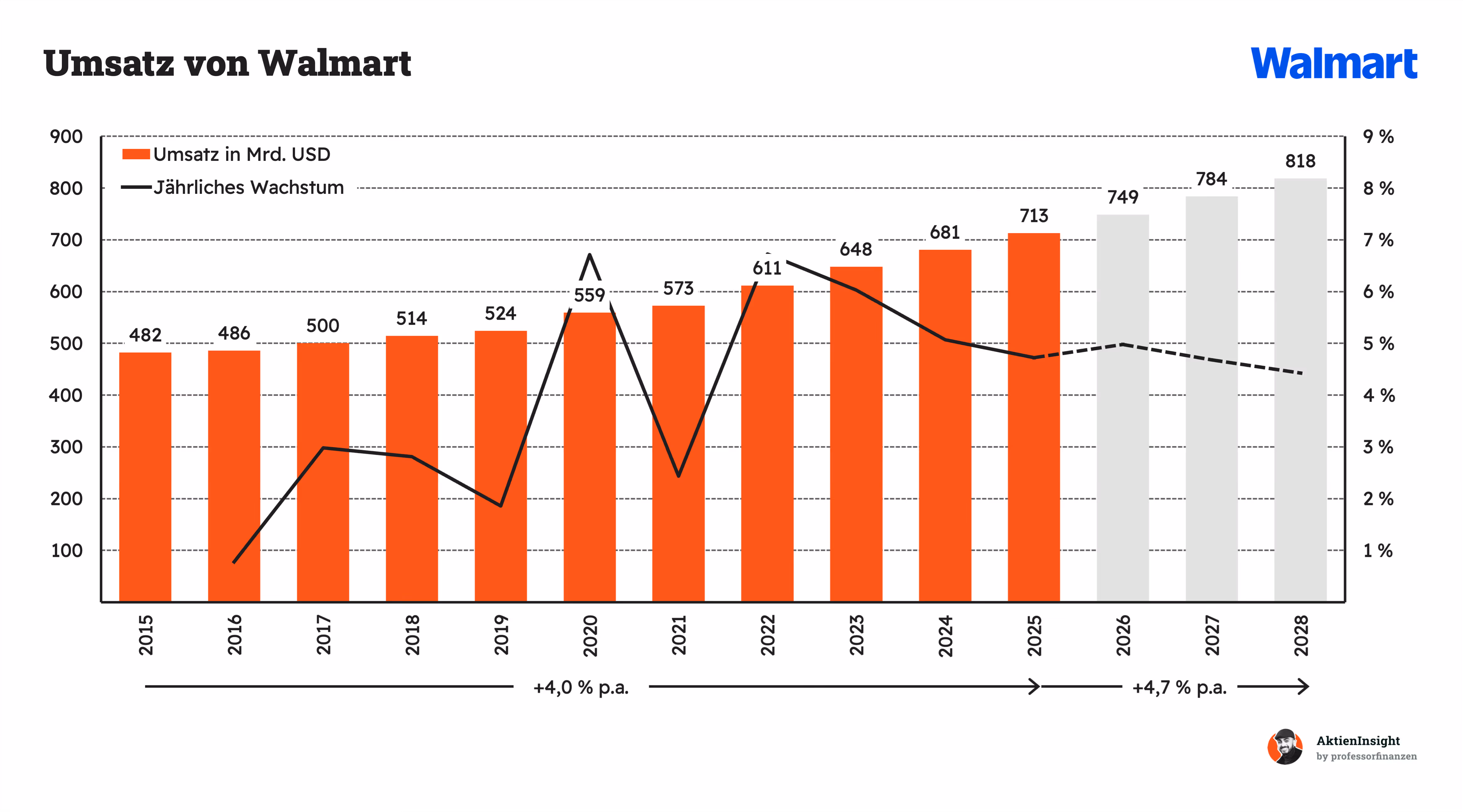 Walmart hat den Umsatz historisch um 4 % pro Jahr gesteigert. Dabei war das Wachstum sehr stetig. Der Umsatz ist wie an der Schnur gezogen gewachsen. Selbst in schwierigen Jahren konnte Walmart um mindestens 2 % wachsen. In vielen Jahren sogar mehr. Inzwischen hat sich das Wachstum auf 4 % bis 5 % pro Jahr beschleunigt.